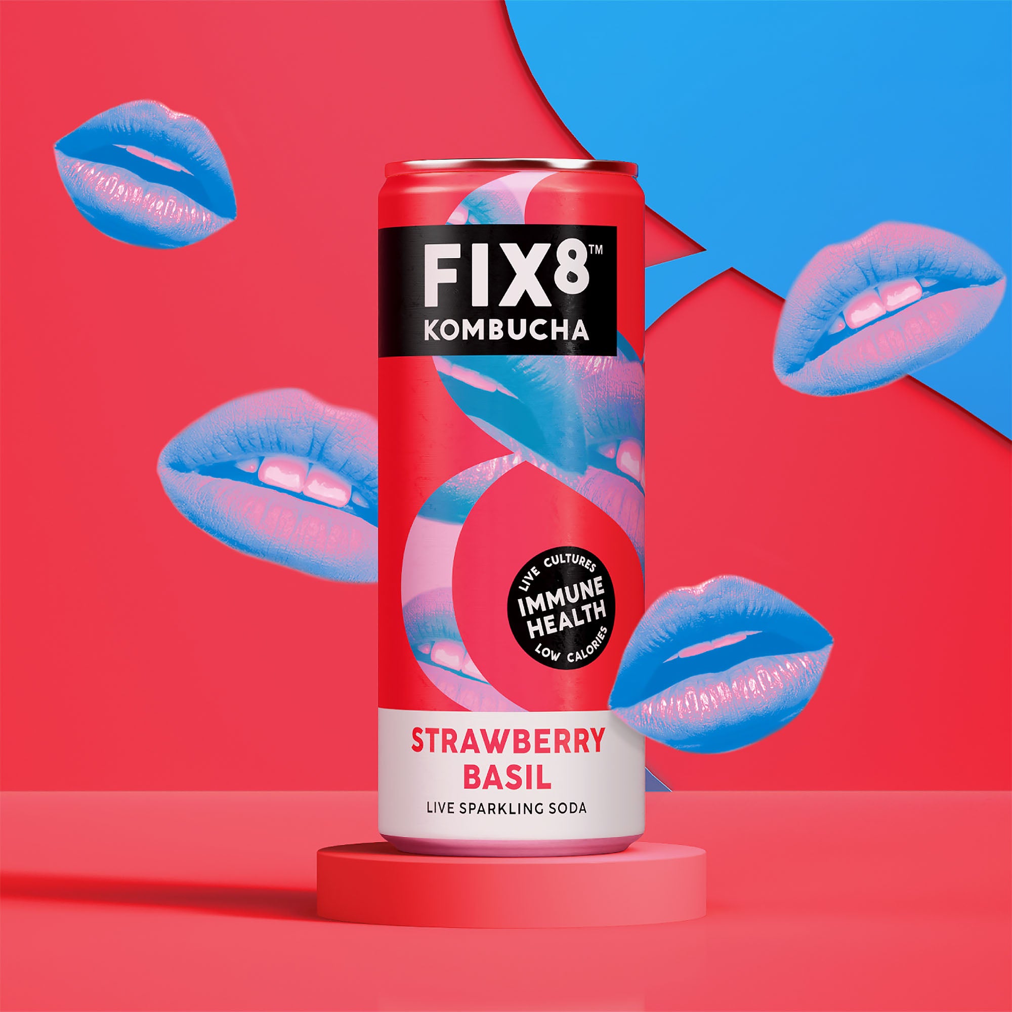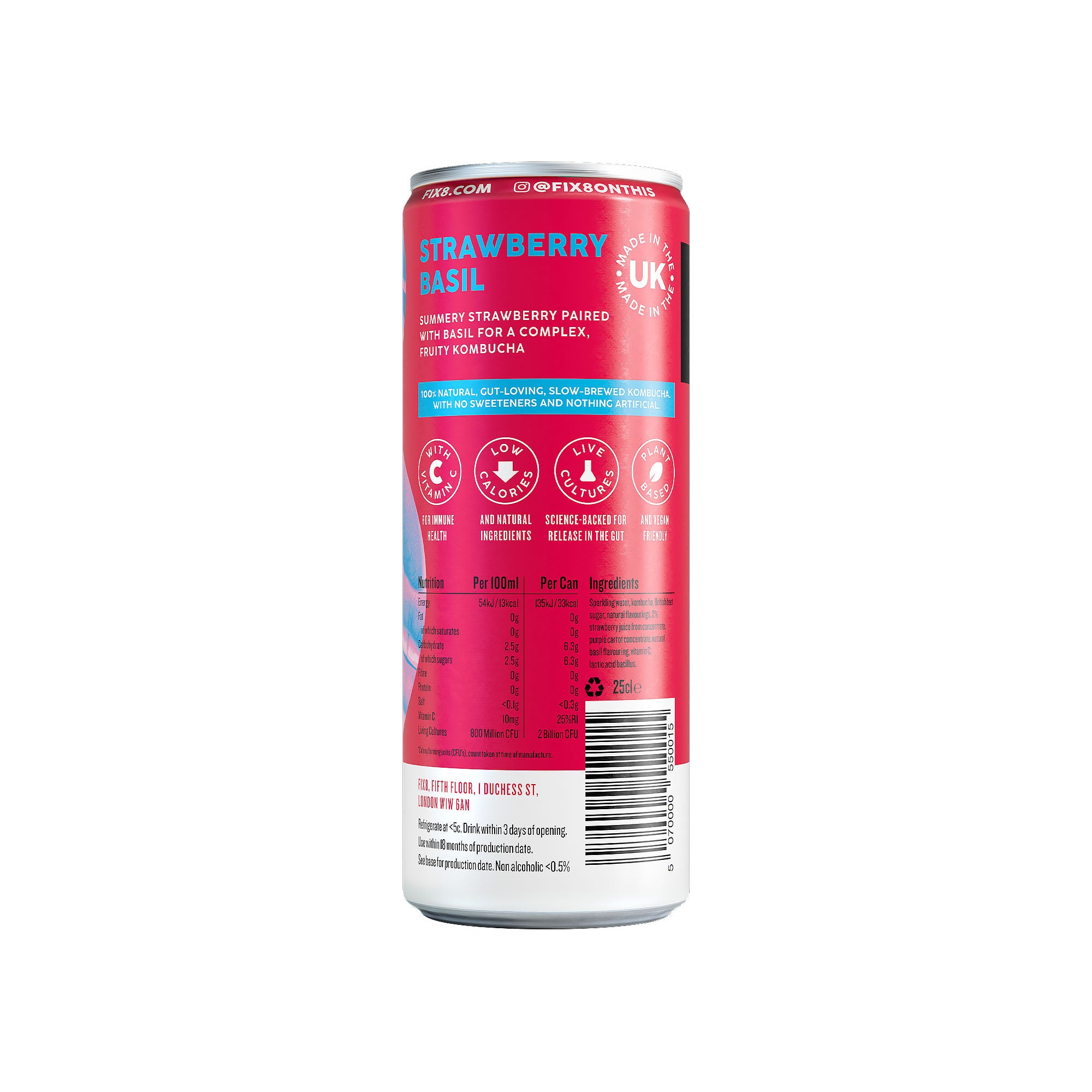 "Fruity and delicious. Slow brewed, authentic Fix8 kombucha paired with summer strawberries and basil, for a fruity and refreshing lift.With added live cultures for targeted release in the gut, and 25% of your reccommended daily Vitamin C. Tasting notes: "