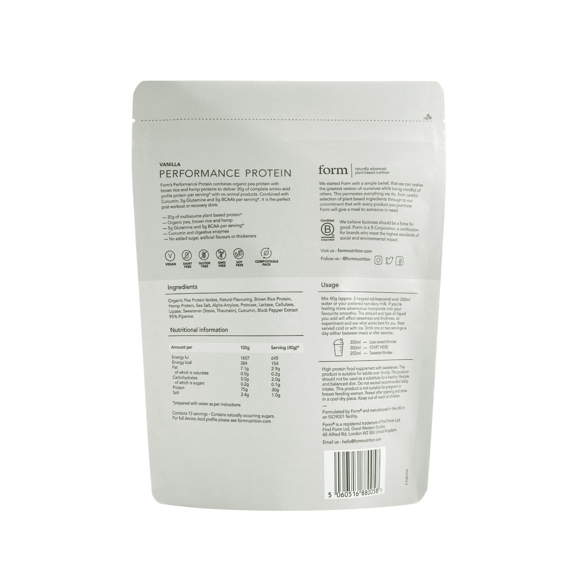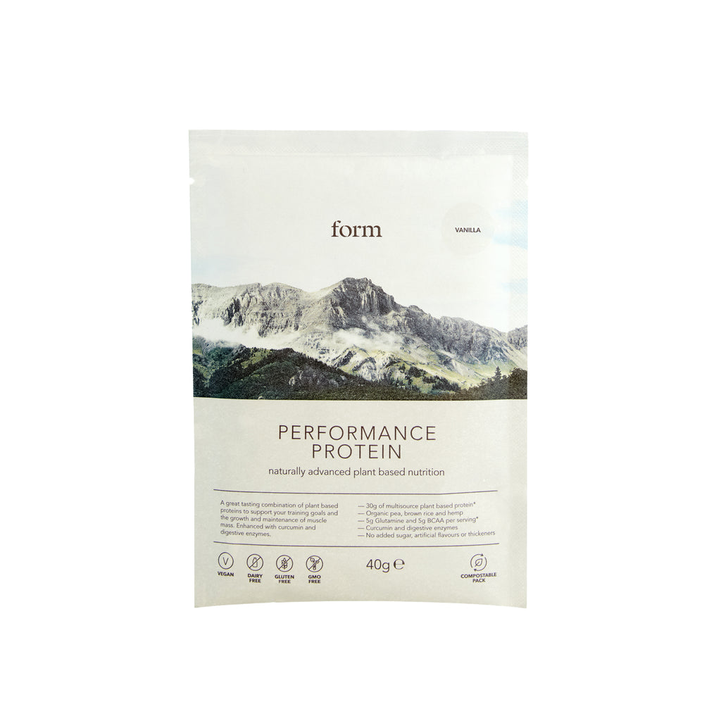 "Form’s Performance Protein combines organic pea protein with brown rice, hemp and AlgaVia® whole algae protein to deliver 30g of complete amino acid profile protein per serving with no animal products. Combined with Curcumin C3 and 5g BCAA’s per serving, it is the perfect post workout or recovery drink complete with probiotics."