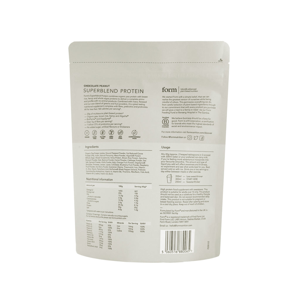 "Form’s Superblend vegan protein powder rises to the challenge of your active lifestyle, redefining the “protein shake”.A base of organic pea protein with brown rice and pumpkin seed proteins delivers a complete amino acid profile with no animal products.Combined with maca, flaxseed and our own blend of greens and fruit powders, it’s a great tasting vegan protein powder complete with fibre and prebiotics. All for less than 160 calories per serving."