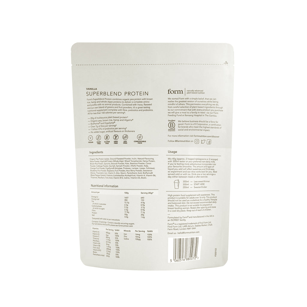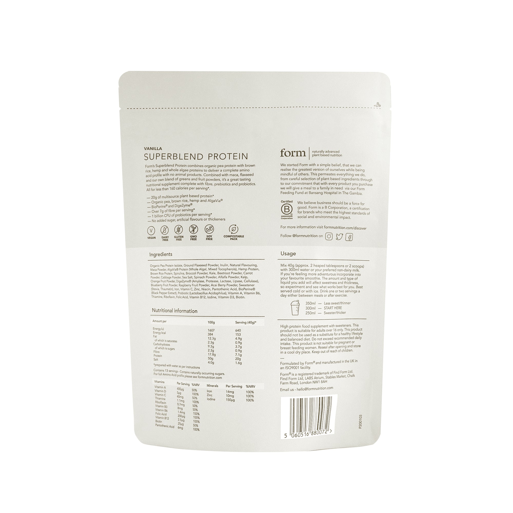 "Form’s Superblend Protein rises to the challenge of your active and busy lifestyle, redefining the “protein shake”. A base of organic pea protein with brown rice, hemp and AlgaVia® whole algae proteins deliver a complete amino acid profile with no animal products. Combined with maca, flaxseed and our own blend of greens and fruit powders, it’s a great tasting nutritional supplement complete with fibre, prebiotics and probiotics. All for less than 160 calories per serving."