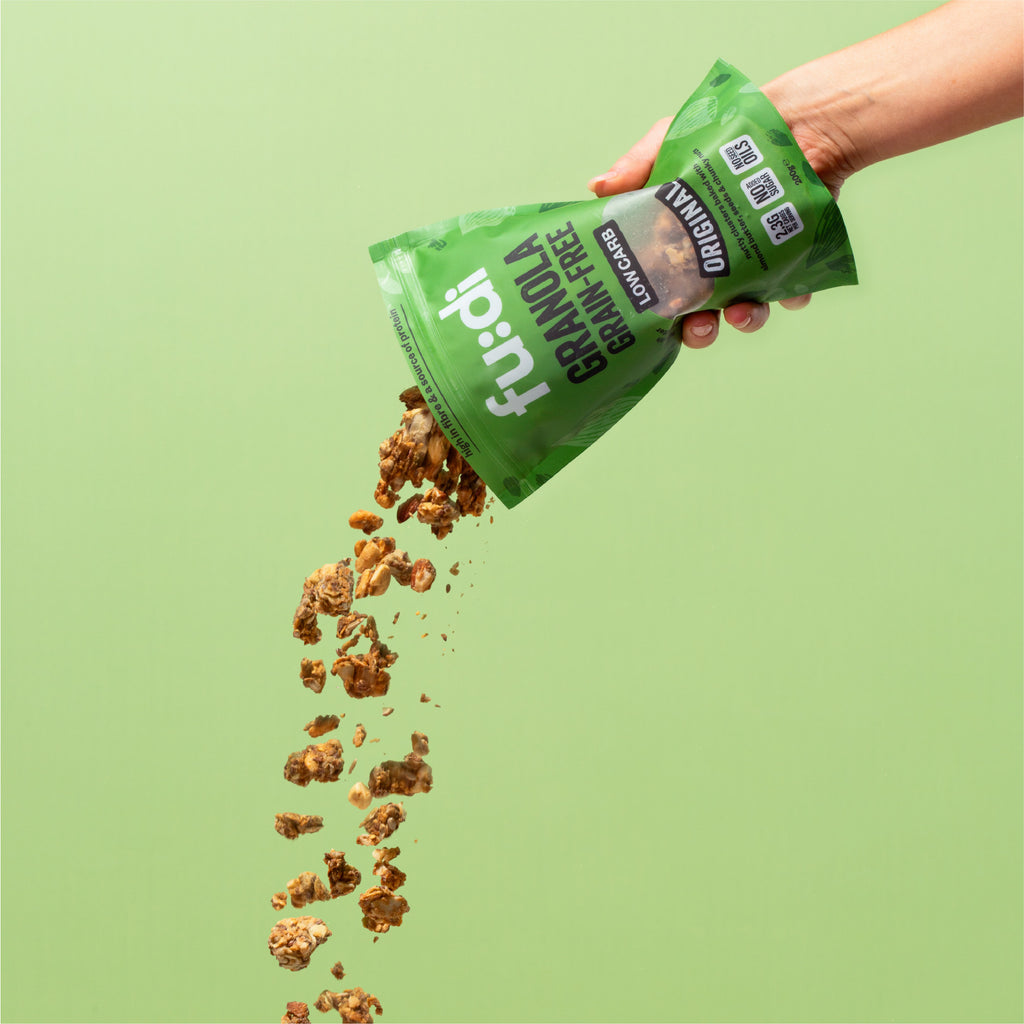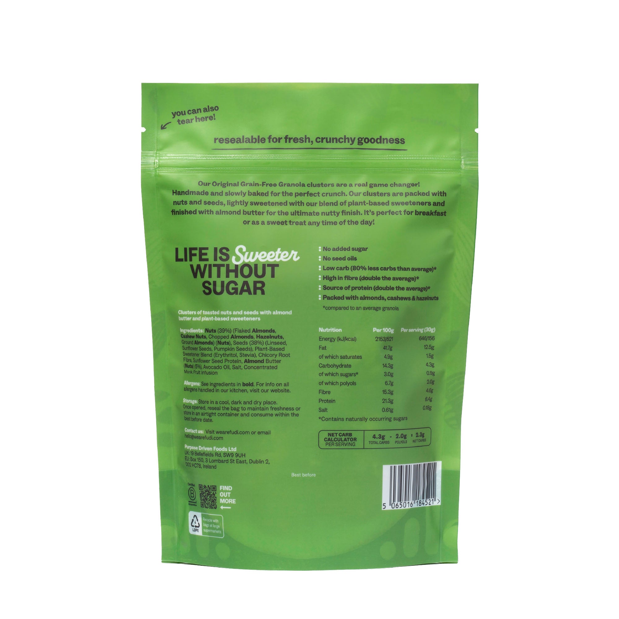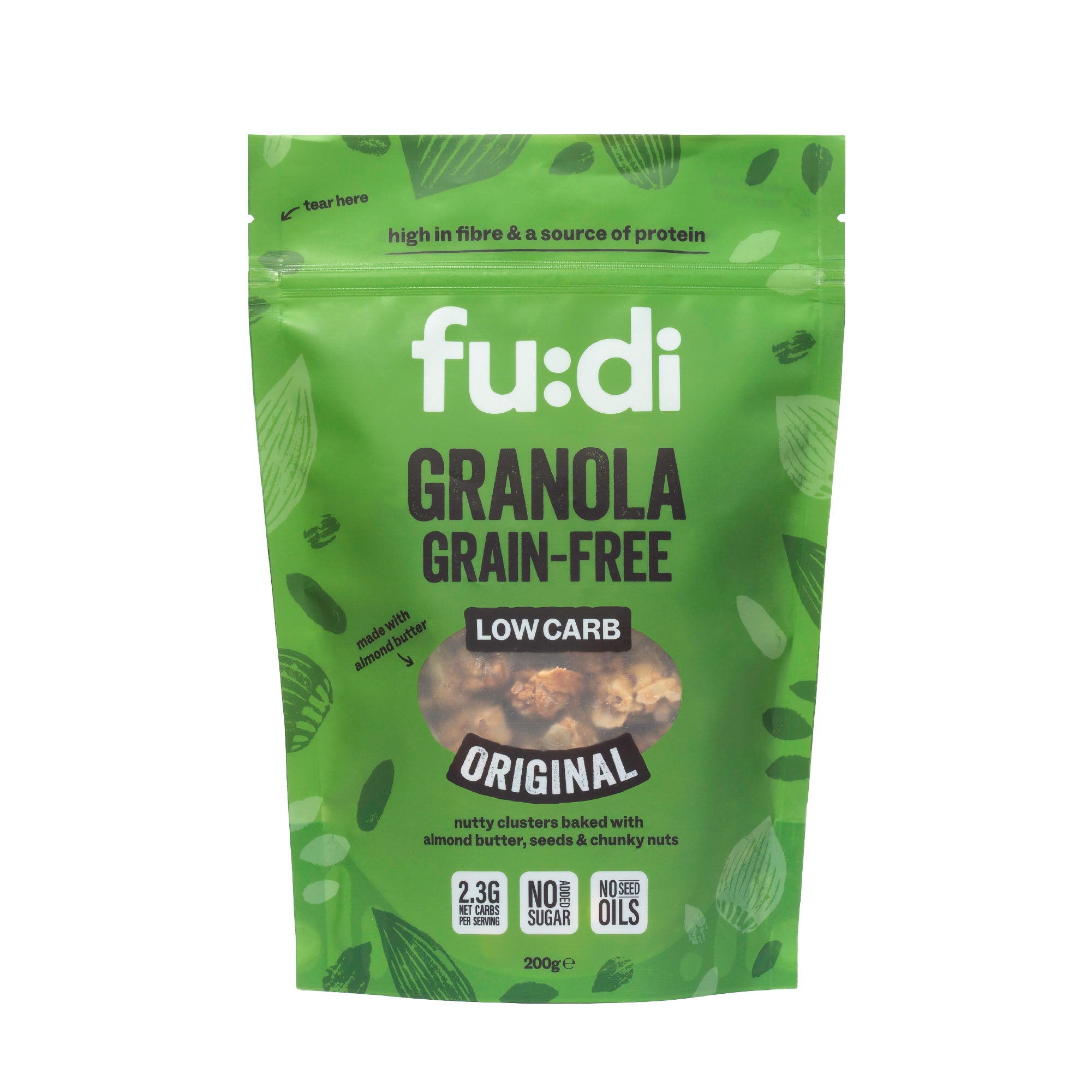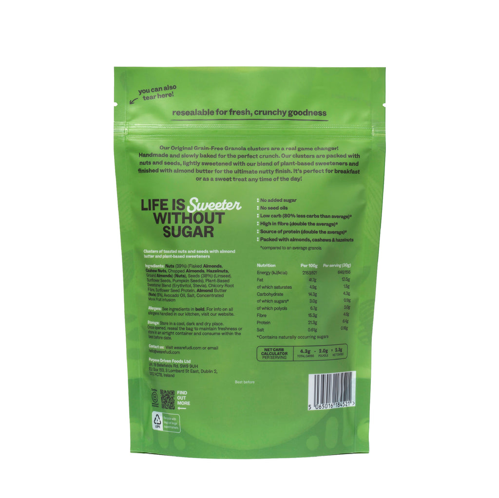 "fu:di Original Grain-Free Granola clusters are a real game changer! Handmade and slowly baked for the perfect crunch. The clusters are packed with nuts and seeds, lightly sweetened with a blend of plant-based sweeteners and finished with almond butter for the ultimate nutty finish. It’s perfect for breakfast or as a sweet treat any time of the day!"