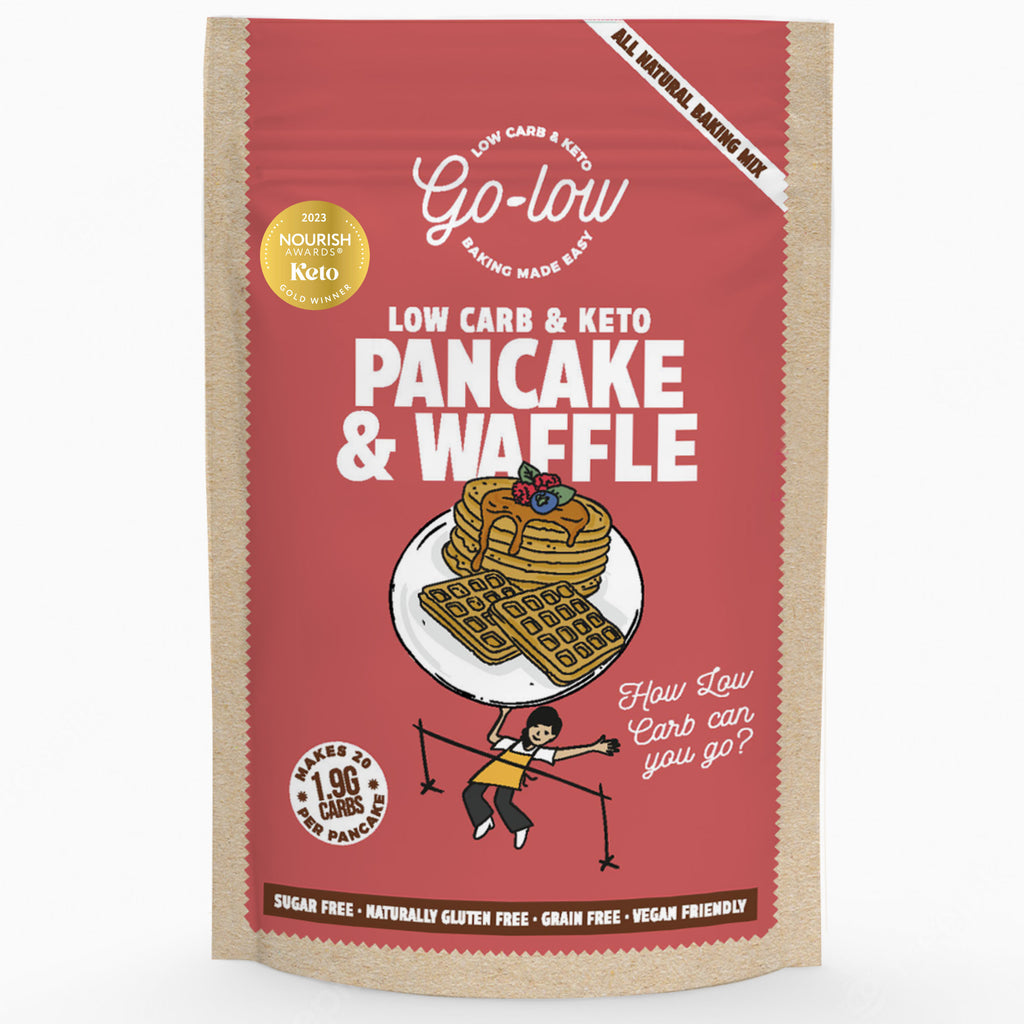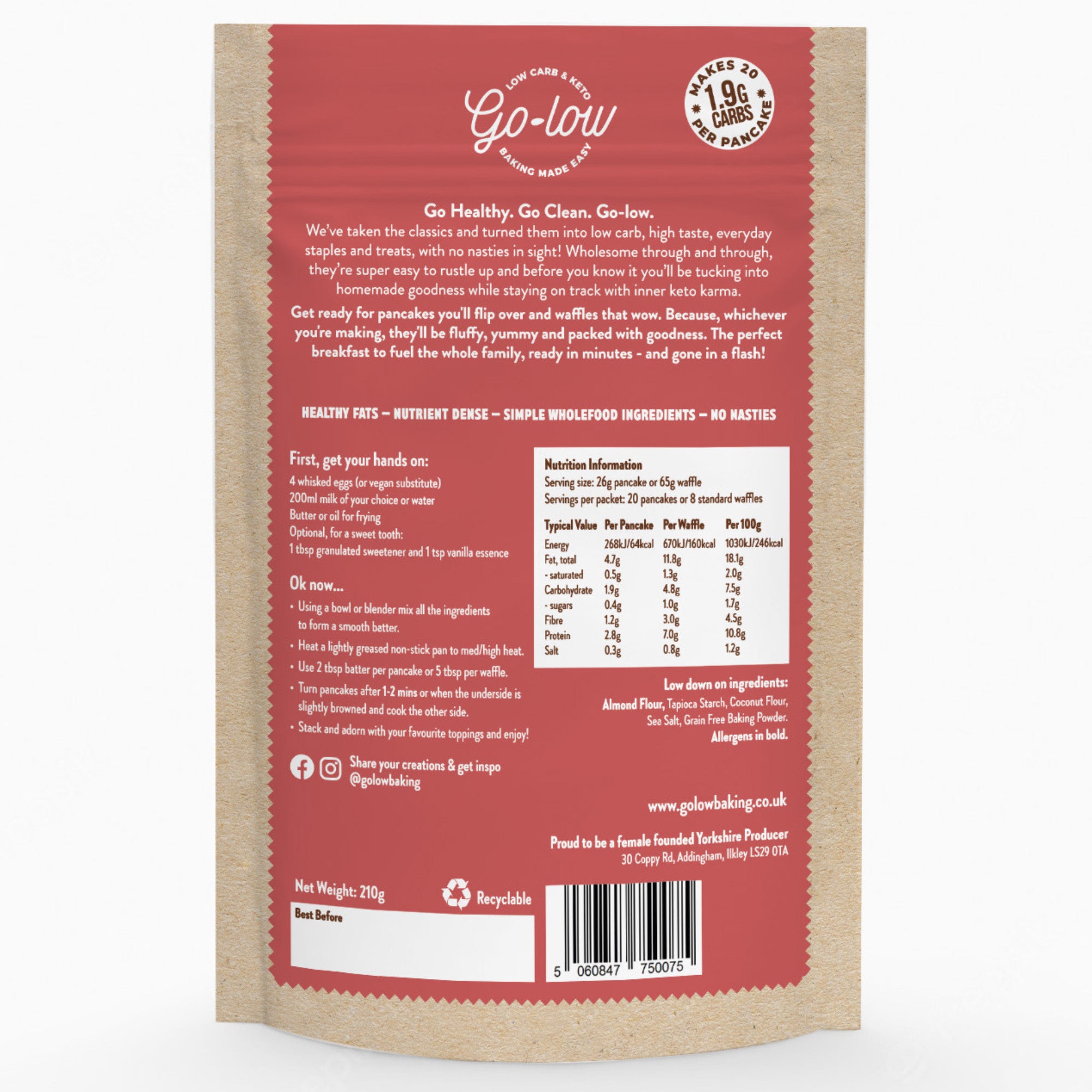 "Go-low Pancake & Waffle Mix that's low carb, keto and diabetic friendly. A fluffy and light American-style pancake mix that also makes fabulous waffles. Just add water and eggs, or vegan substitute, and make 20 pancakes in minutes. Each one has just 1.9g carbs and is completely sugar free and made from nutritious wholefood ingredients, so great as a healthy alternative for the whole family. Free from additives and preservatives, and made from totally natural, clean ingredients. Also gluten free, paleo, wheat free and vegan friendly."