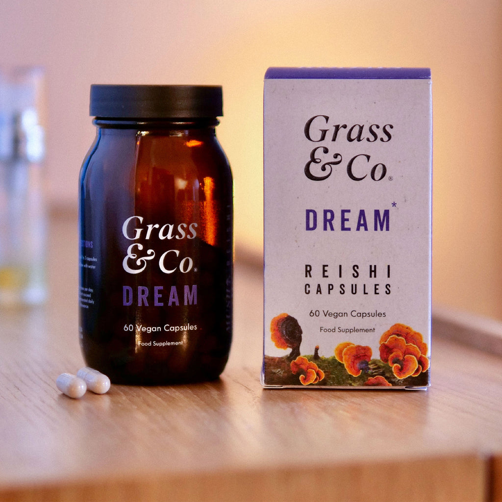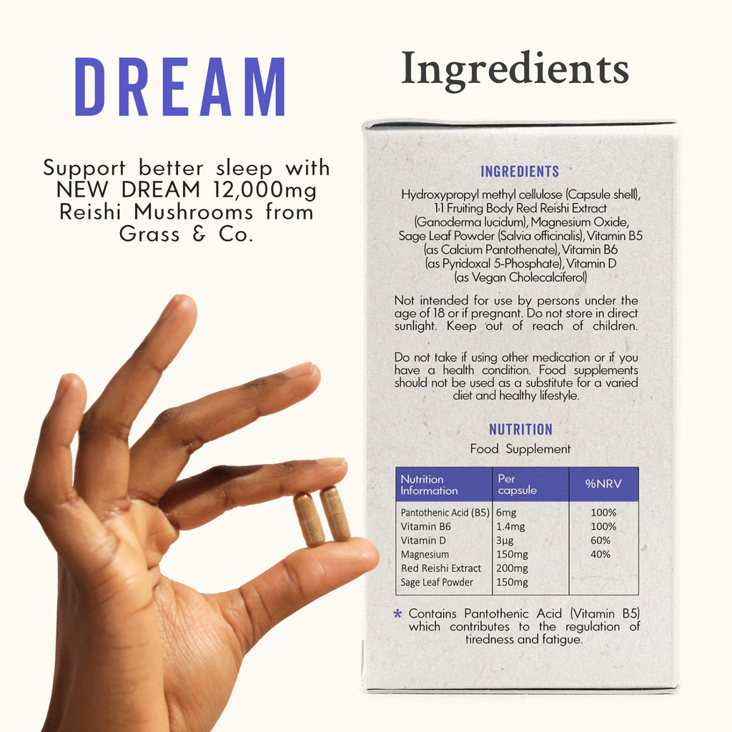 "Grass & Co. deliver the highest quality and certified organic concentrated mushroom, adaptogen and vitamin-packed blends that deliver specific health benefits. If you’re new to functional mushrooms, the DREAM Reishi Mushrooms Vegan Capsules are a great starting point. Each flavourless capsule contains 200mg of the full spectrum of the mushrooms' fruiting bodies and are rich in active compounds including beta-glucan polysaccharides. This unique botanical blend also includes Vitamins B6, B6 & D which help to regulate hormonal activity and support mind and body during your monthly cycle. Grass & Co. Mushrooms are non-GMO, gluten-free, cruelty-free and contain no additives, mycelium, grains or any fillers."