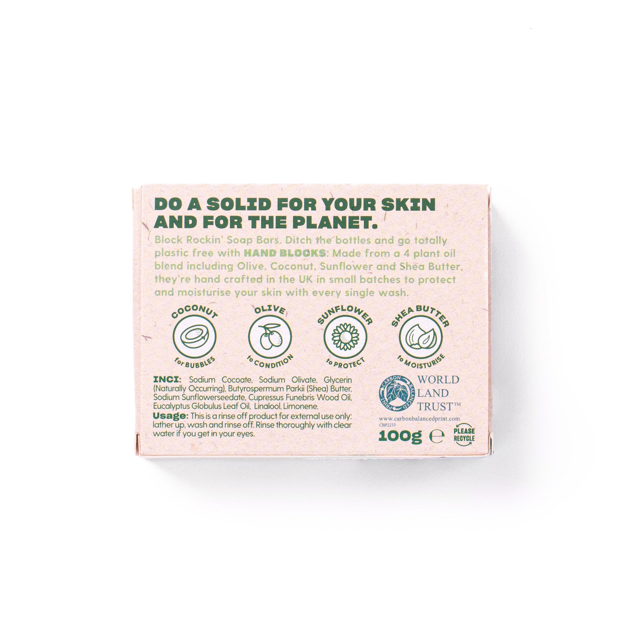 "Block rockin’ soap bars. Ditch the bottles and go totally plastic free with HAND BLOCKS: made from a 4 plant oil blend including Olive, Coconut, Sunflower and Shea Butter, they’re hand crafted in the UK in small batches to protect and moisturise your skin with every single wash.Olive: For sleek skin conditioningCoconut: :For big bubbles and moisurising effectSunflower: For protection, with vitamin E and antioxidantsShea Butter: For moisturisingHAND BLOCKS are palm oil free, as well as being free from plastic, SLS, SLES and parabens."