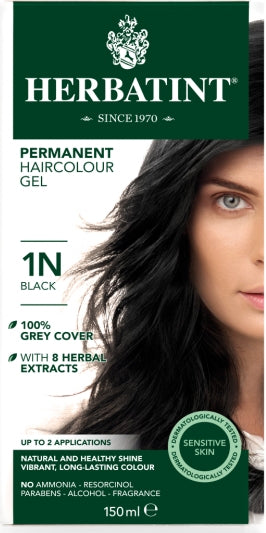 "Herbatint permanent herbal hair colour in Black. Vegan. Suitable for sensitive skin. Grey cover guaranteed. 8 herbal extracts, specifically selected to nourish and protect your hair and scalp, enhance your hair's color intensity and leave you with a natural, long lasting result."