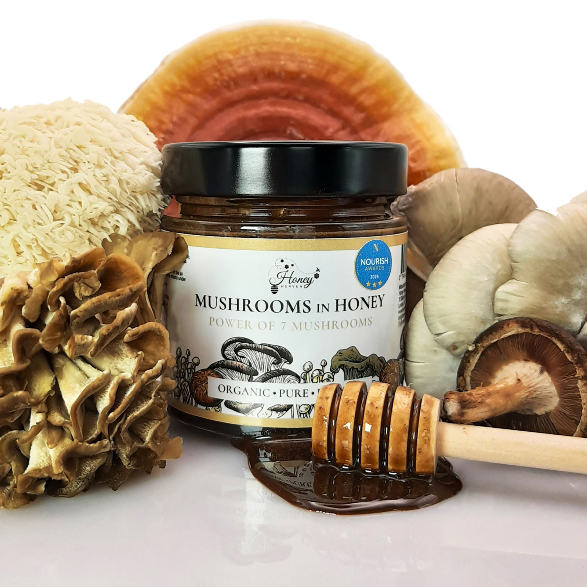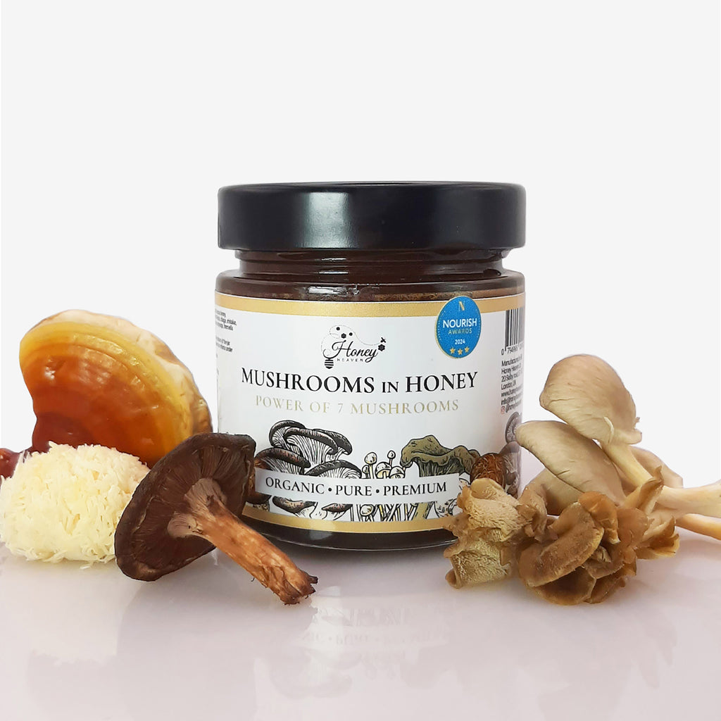 "UK's first organic Mushroom Honey. Crafted with organic raw Hungarian acacia honey and seven organic mushrooms grown in Hampshire, UK, this is the first mushroom-infused honey of its kind. Produced in Hungary using certified organic methods, it delivers exceptional purity, quality, and taste. Smooth, floral, and delicately sweet, it’s free from artificial additives, and emulsifiers. Inside each jar, you’ll find the exquisite rich cocoa flavor and the natural power of adaptogens Reishi, Chaga, Shiitake, Maitake, Lion’s Mane, Cordyceps, and Tremella mushrooms. A truly innovative blend of tradition and nature."
