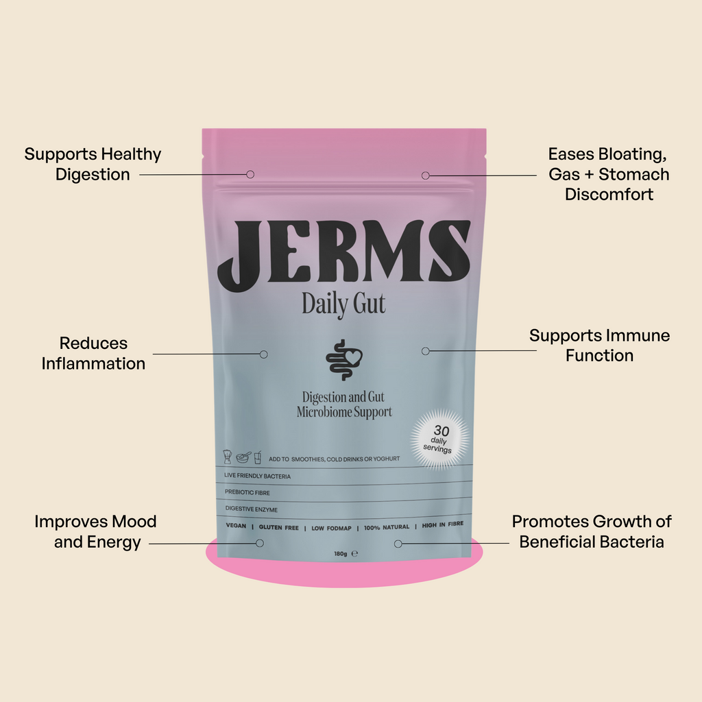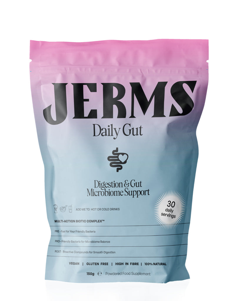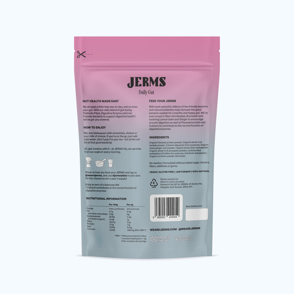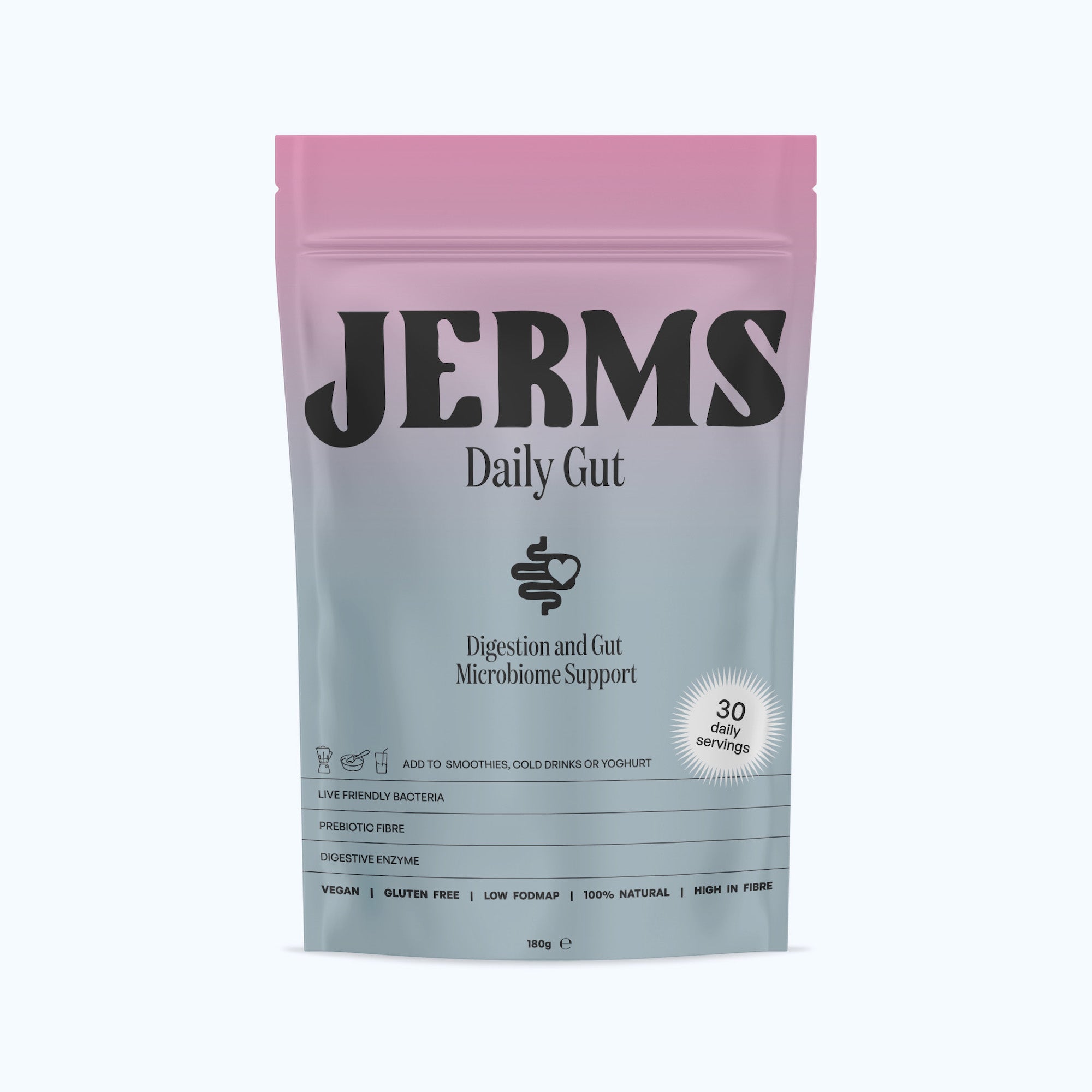 "JERMS Daily Gut is an award winning 4-in-1 gut supplement. A synergistic formula of Probiotics, Prebiotic Fibre, Digestive Enzymes, Organic Superfoods and Vitamins work in harmony together to deliver complete gut support. JERMS philosophy centres around taking a holistic approach to gut health - we believe it’s about more than just popping a probiotic; it's about actually preparing and maintaining an environment where the friendly bacteria can grow and flourish.A premium blend of 10 billion CFU of one of the world’s most researched Probiotics, scientifically proven to be resistant to stomach acid, supported by Prebiotic Fibre to feed your good bacteria, Digestive Enzymes to increase nutrient absorption and support the gut lining, and Organic Superfoods like Flaxseed, rich in Omega 3 fatty acids to help reduce inflammation and improve bowel regularity.Benefits of Daily Gut:Supports Healthy Digestion and Bowel RegularityEases Bloating, Gas, Stomach Discomfort and IBS symptomsPromotes Growth of Beneficial BacteriaHelps Reduce InflammationVoted ‘Best Powder Gut Supplement’ by The Independent and crowned the 'Best Digestive Supplement' in the 2024 Women's Fitness Nutrition Awards. Finalist 'Best For Gut Health' and 'Best Newcomer' in the 2024 Get the Gloss AwardsUnflavoured; 1 month supply"