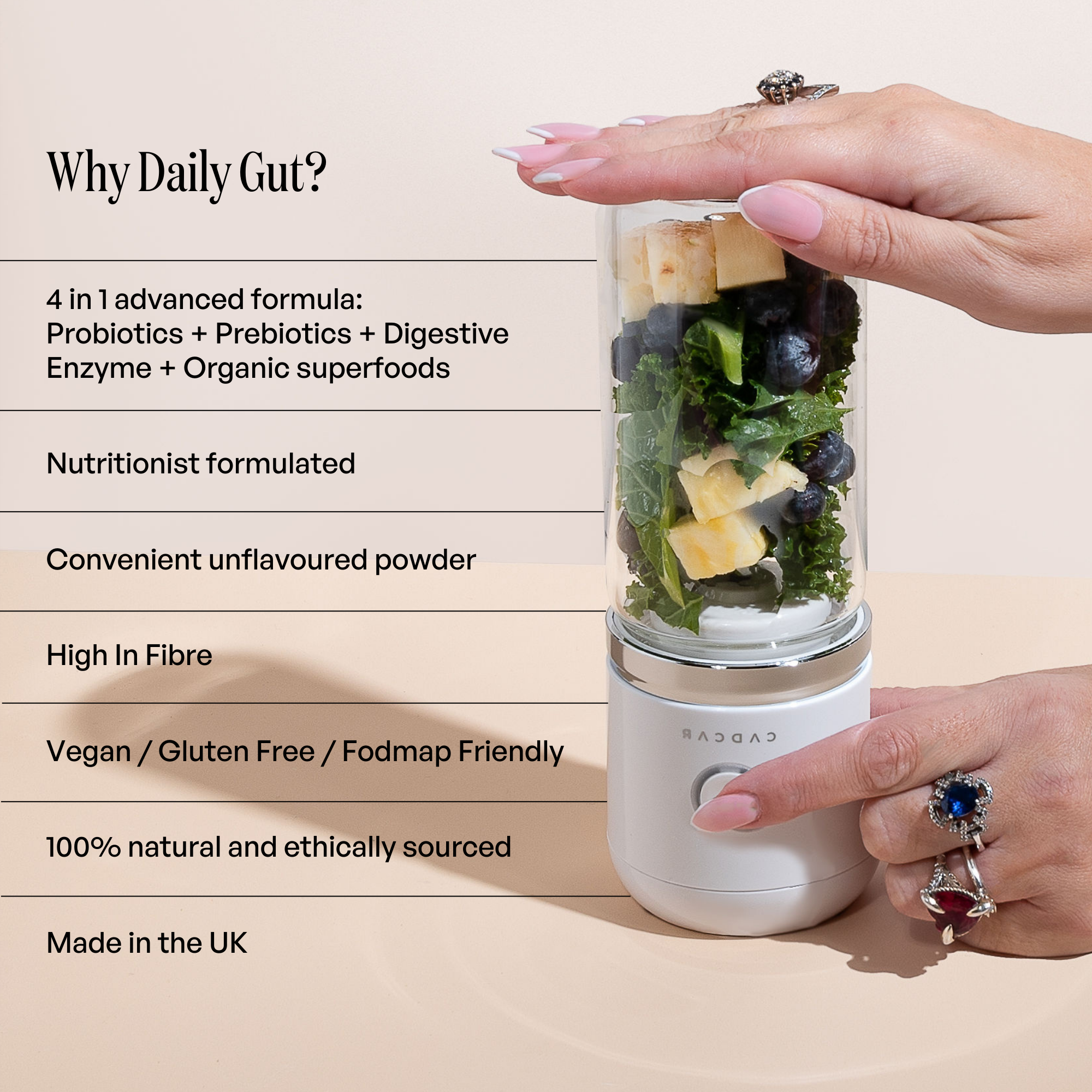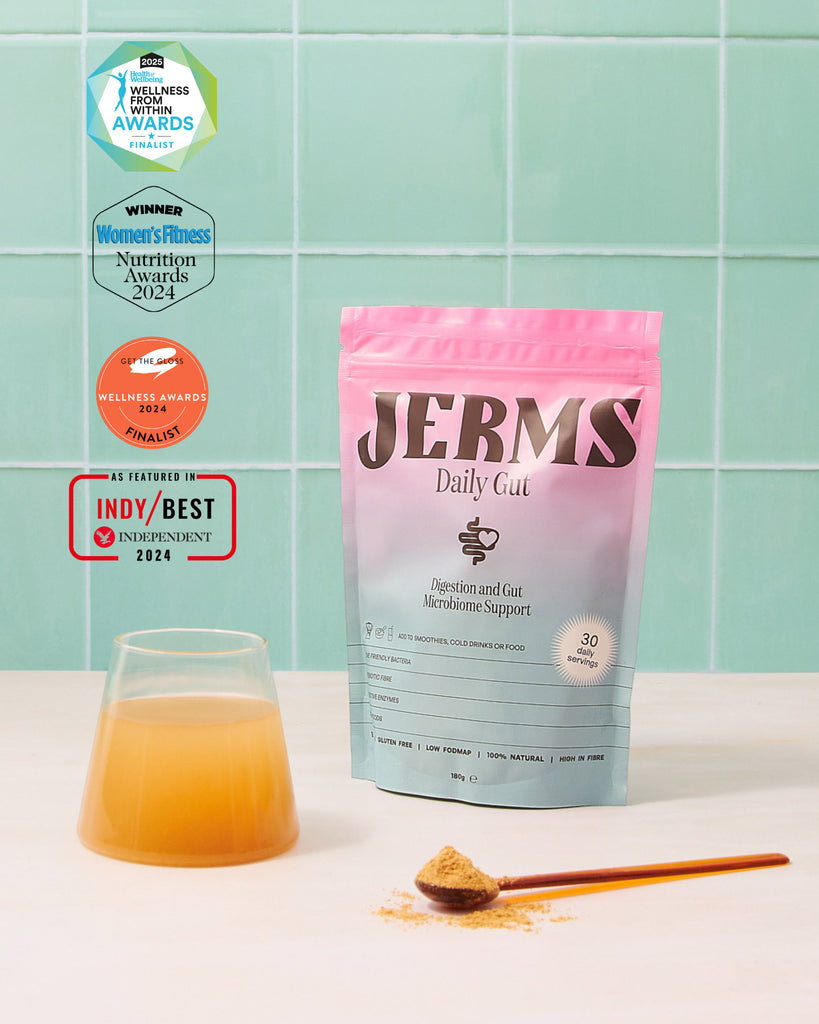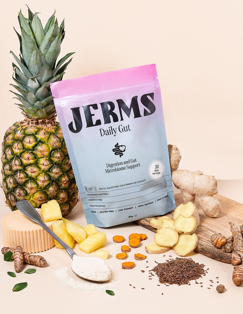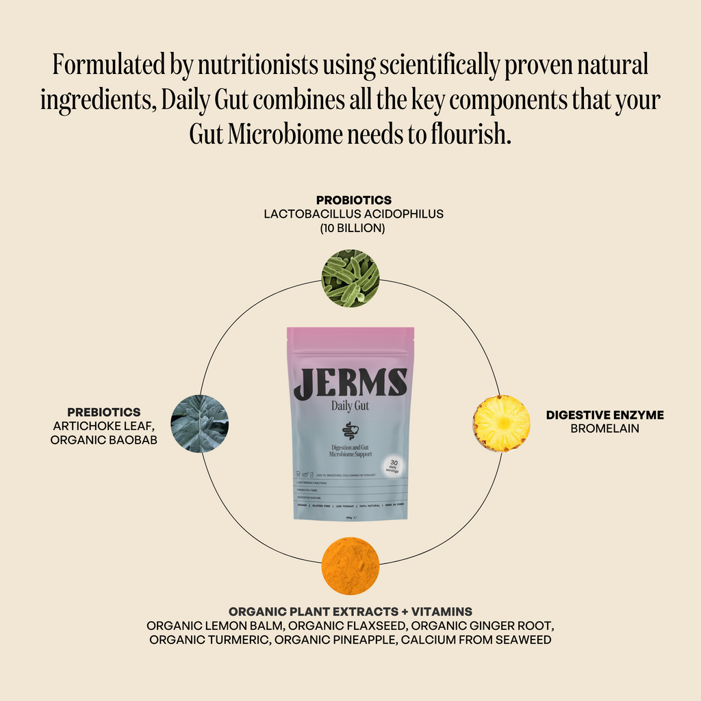 "JERMS Daily Gut is an award winning 4-in-1 gut supplement. A synergistic formula of Probiotics, Prebiotic Fibre, Digestive Enzymes, Organic Superfoods and Vitamins work in harmony together to deliver complete gut support. JERMS philosophy centres around taking a holistic approach to gut health - we believe it’s about more than just popping a probiotic; it's about actually preparing and maintaining an environment where the friendly bacteria can grow and flourish.A premium blend of 10 billion CFU of one of the world’s most researched Probiotics, scientifically proven to be resistant to stomach acid, supported by Prebiotic Fibre to feed your good bacteria, Digestive Enzymes to increase nutrient absorption and support the gut lining, and Organic Superfoods like Flaxseed, rich in Omega 3 fatty acids to help reduce inflammation and improve bowel regularity.Benefits of Daily Gut:Supports Healthy Digestion and Bowel RegularityEases Bloating, Gas, Stomach Discomfort and IBS symptomsPromotes Growth of Beneficial BacteriaHelps Reduce InflammationVoted ‘Best Powder Gut Supplement’ by The Independent and crowned the 'Best Digestive Supplement' in the 2024 Women's Fitness Nutrition Awards. Finalist 'Best For Gut Health' and 'Best Newcomer' in the 2024 Get the Gloss AwardsUnflavoured; 1 month supply"