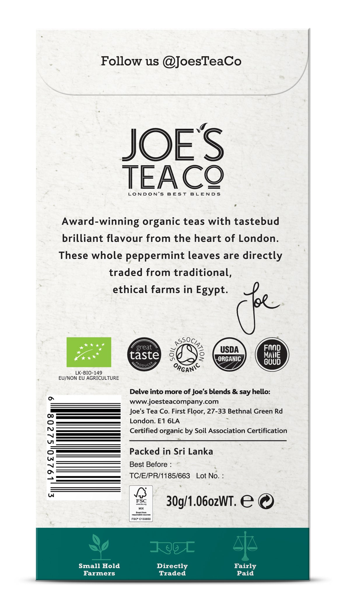 Joe's Tea Co. Proper Peppermint 15x Biodegradeable Pyramid Bags 15 bags