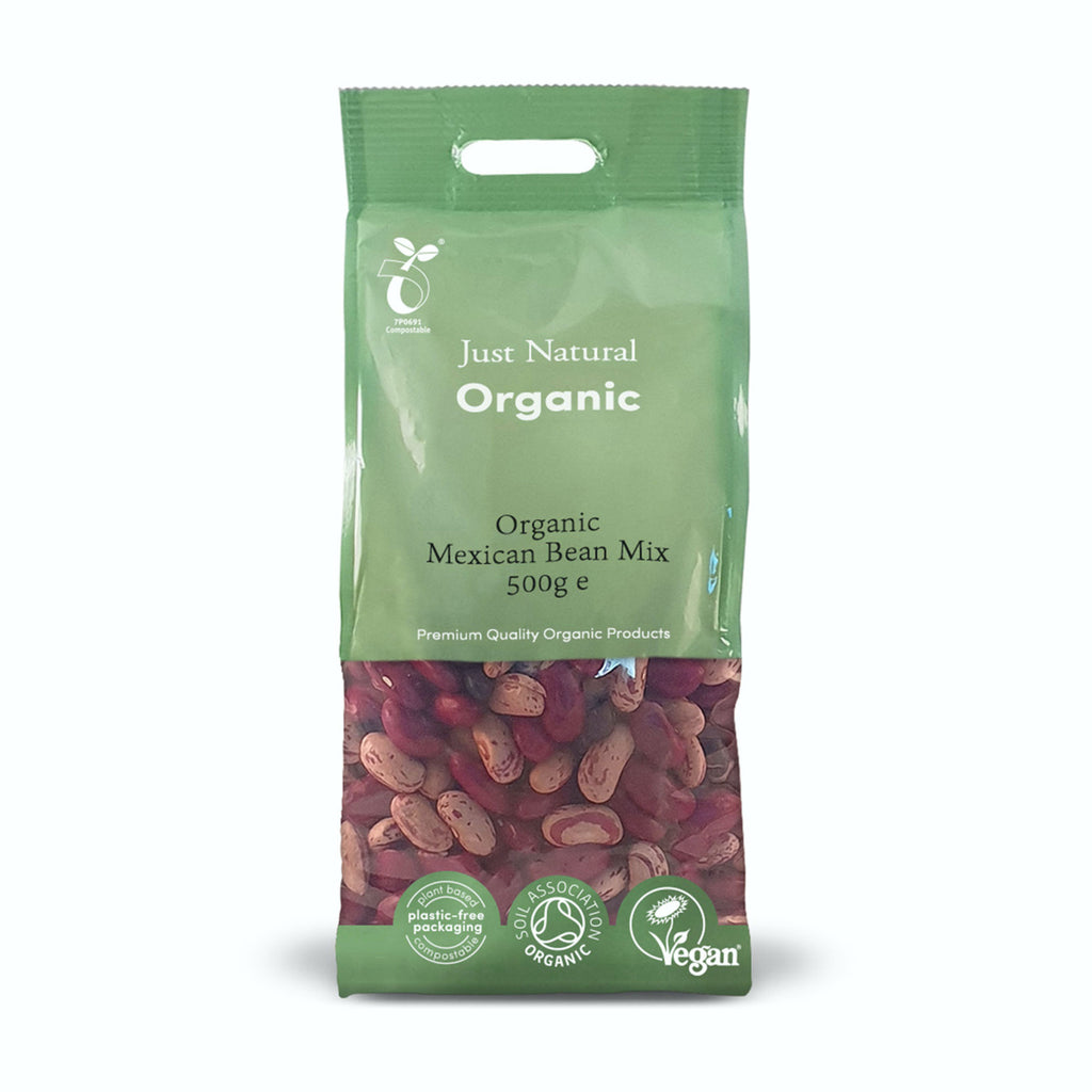 "A mix of organically grown Red Kidney Beans, Pinto Beans and Black Turtle Beans. And it’s packed in 100% plastic free, certified home compostable packaging."