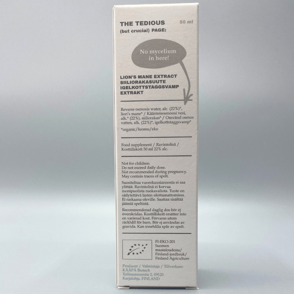 "KÄÄPÄ Lion’s Mane Organic Mushroom Tincture - helps you unlock your cognitive potential with a tincture, crafted to support focus, memory, and digestive health. Grown and manufactured organically in Finland, which boasts of pristine forests and the purest of waters, this tincture harnesses the pure essence of Lions Mane mushrooms, using only fruiting bodies. Ultrasonic Assisted Extraction (UAE) technology ensures the highest bioavailability of essential compounds, providing a potent and effective supplement beyond that of conventional mushroom supplements. KÄÄPÄ are committed to transparency and quality—scan the QR code on your product to access detailed batch-specific data on bioactive compounds. With no grains or fillers, this is an honest, premium mushroom tincture that offers unmatched purity and potency."