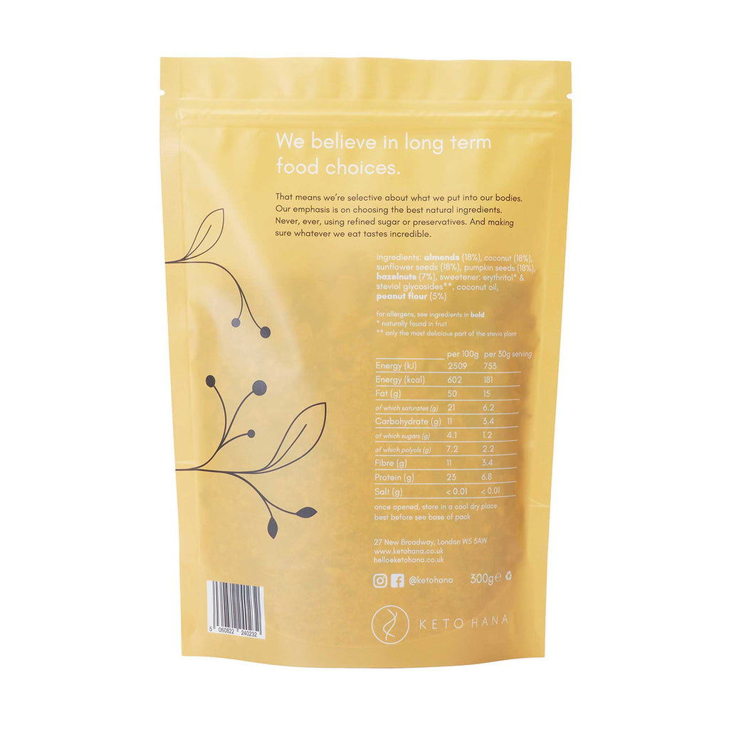 "Keto breakfast, sorted - the way it should be. Effortless. Nutty about nuts? Start your day with the satisfying crunch of our peanut butter granola. Throw it on some yoghurt, or throw some (nut) milk on top. We like it with berries. You could just eat it straight out of the bag. Whatever you do, stop worrying about your macros at breakfast and get on with the day. "