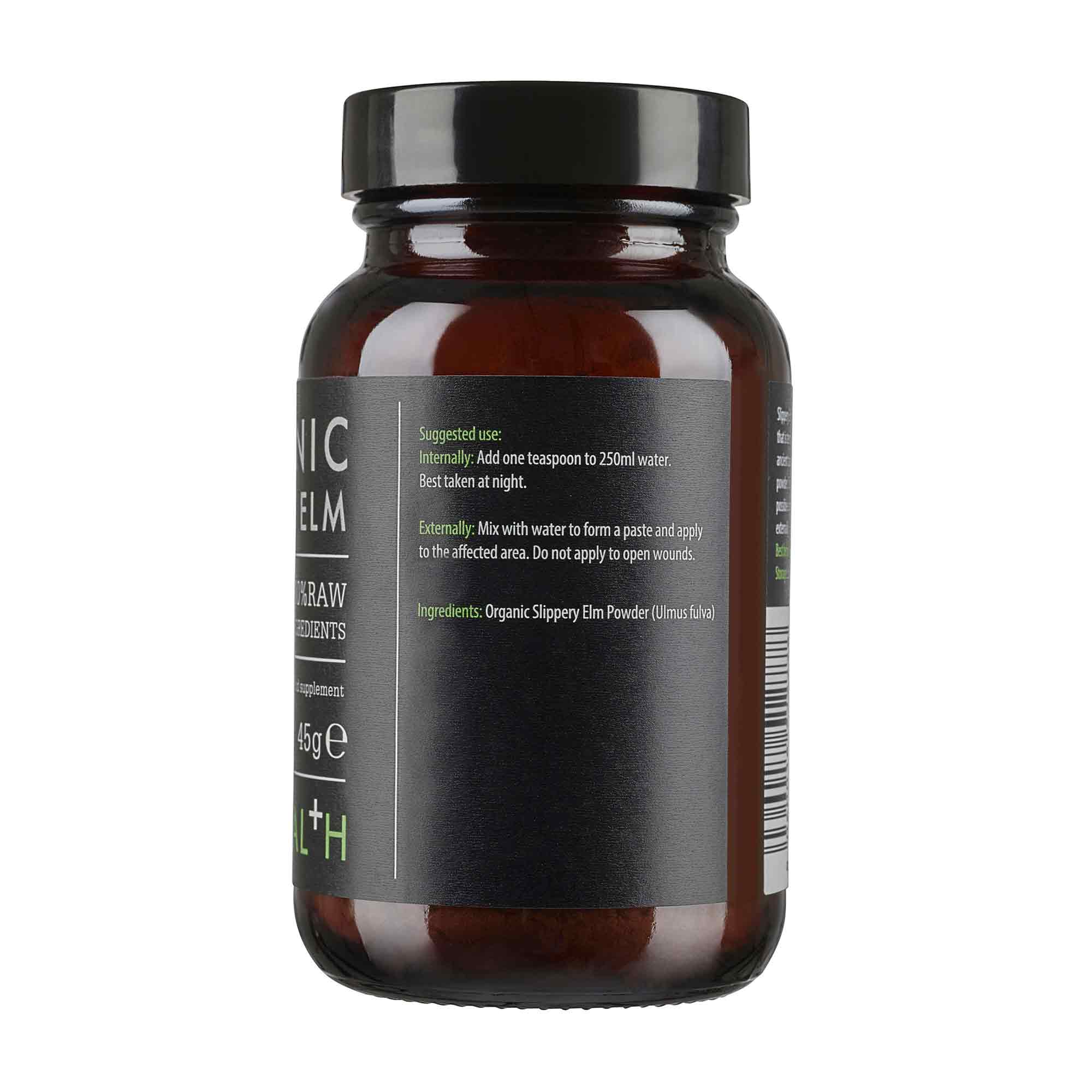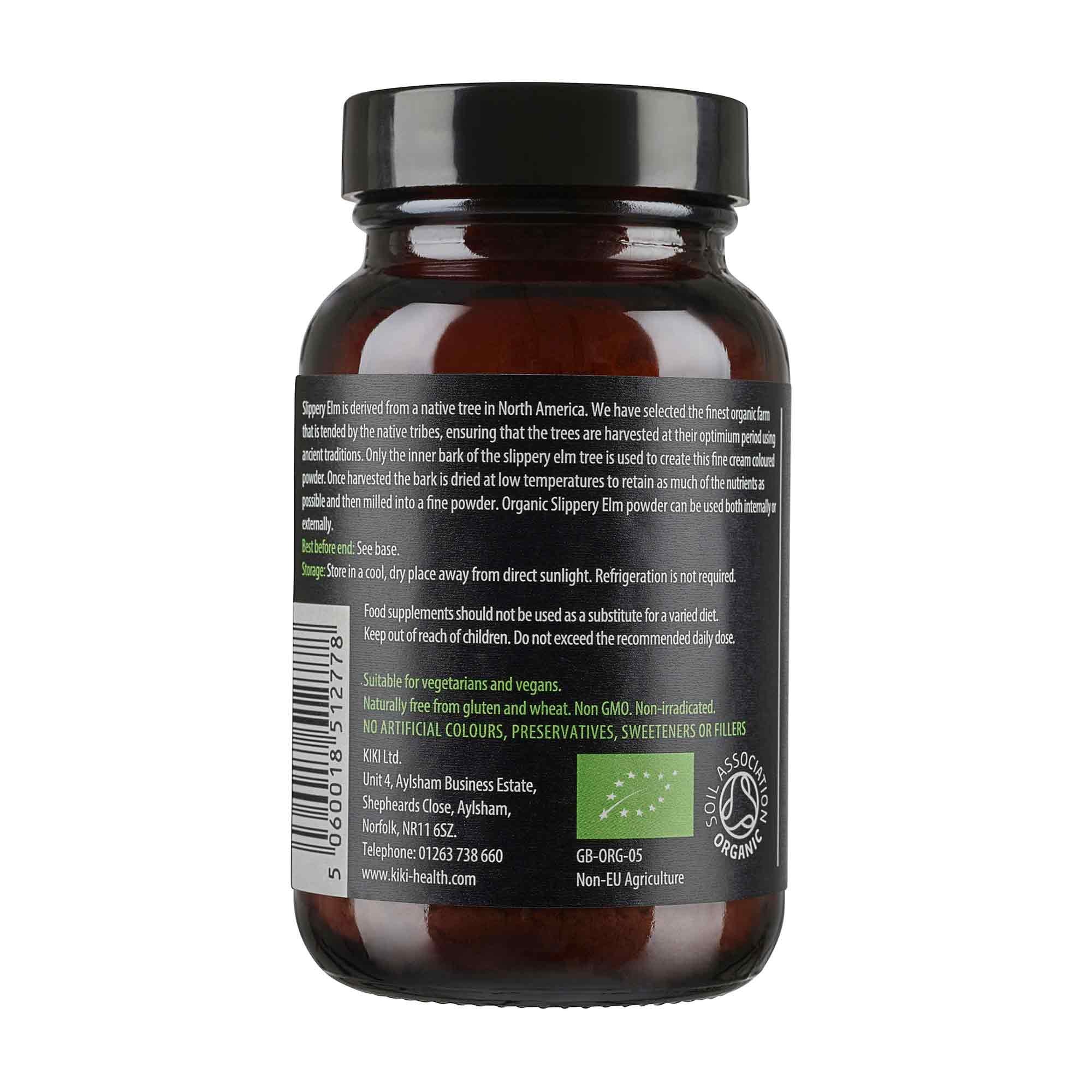 "Slippery Elm is derived from a native tree in North America. We have selected the finest organic farmthat is tended by the native tribes, ensuring that the trees are harvested at their optimium period usingancient traditions. Only the inner bark of the slippery elm tree is used to create this fine cream colouredpowder. Once harvested the bark is dried at low temperatures to retain as much of the nutrients aspossible and then milled into a fine powder. Organic Slippery Elm powder can be used both internally orexternally."