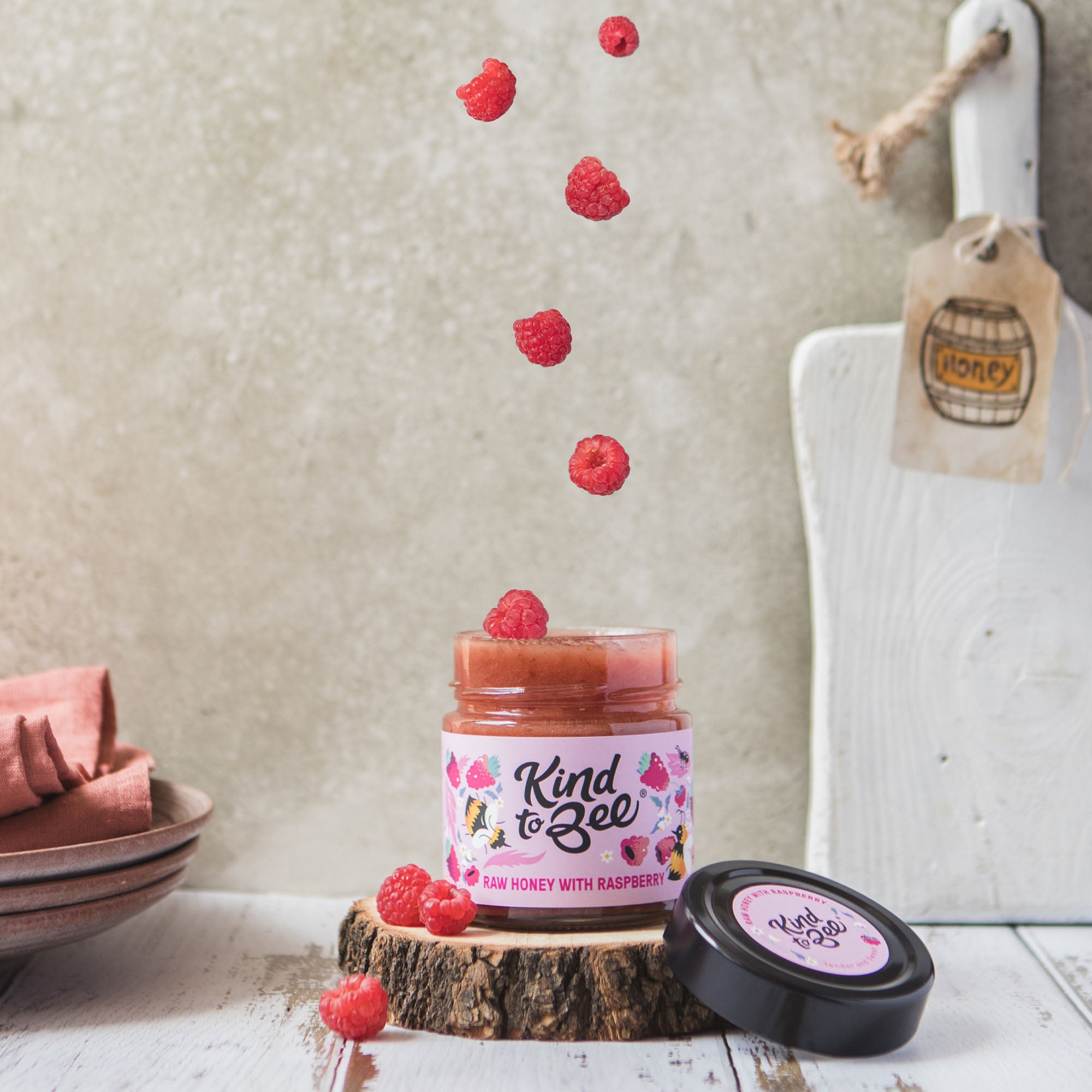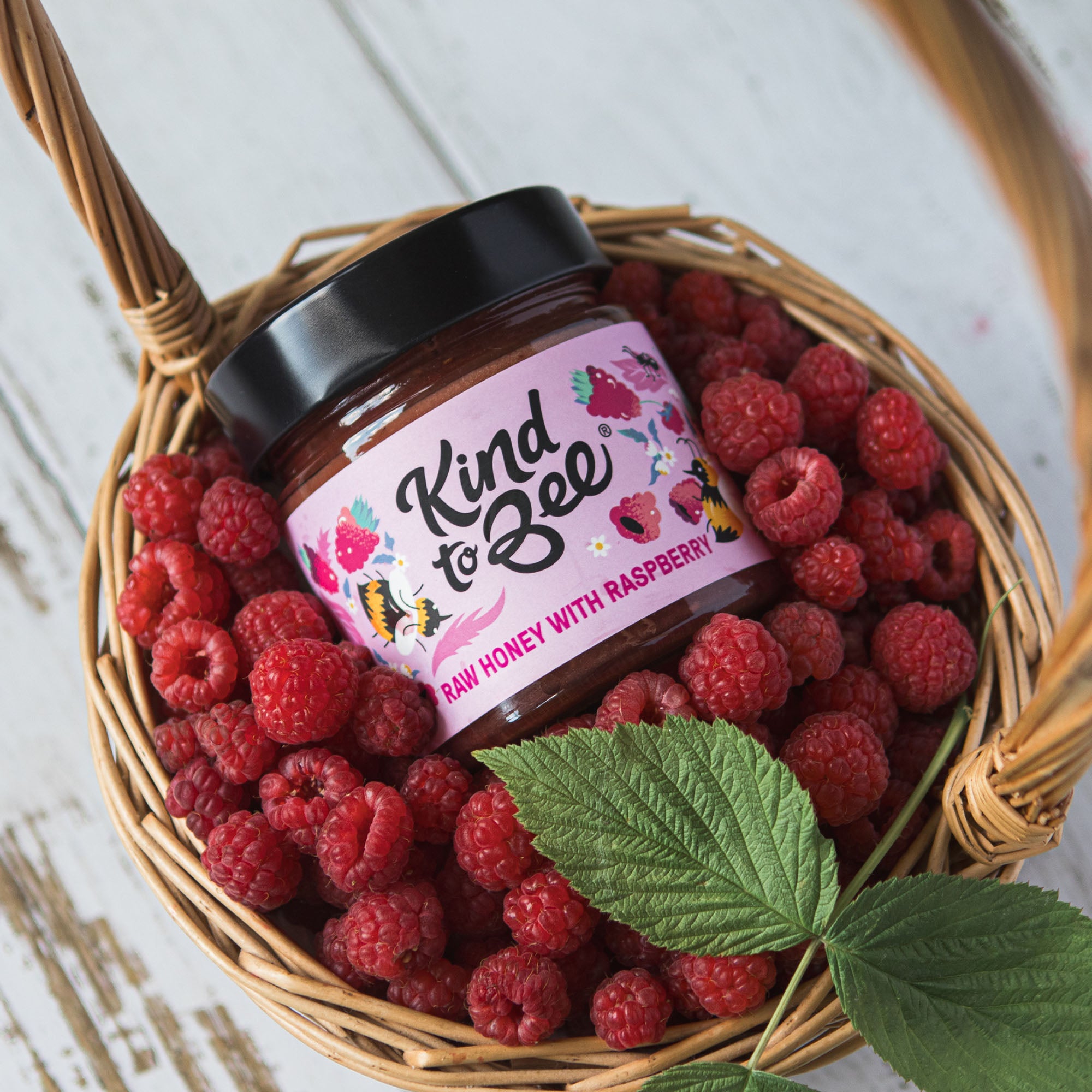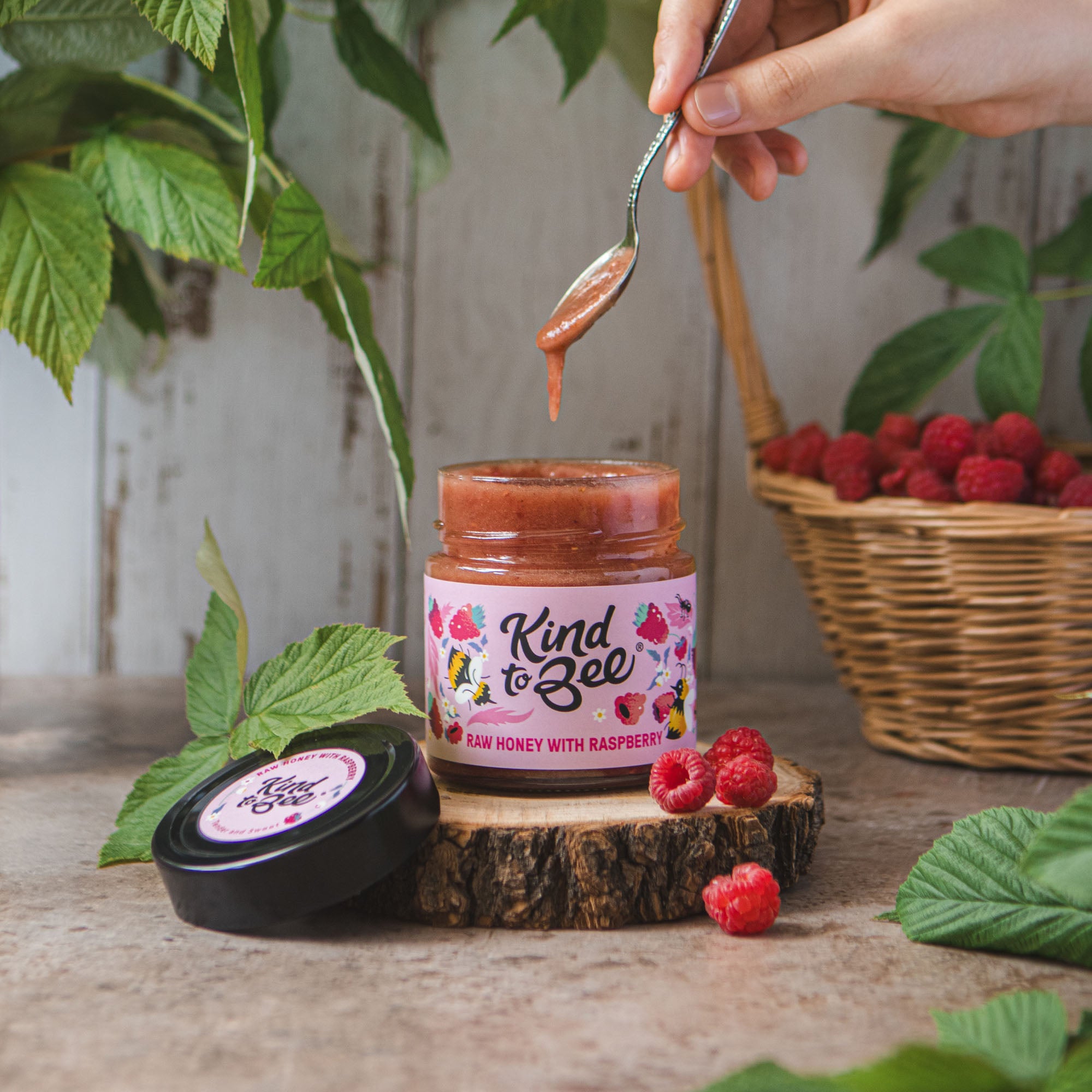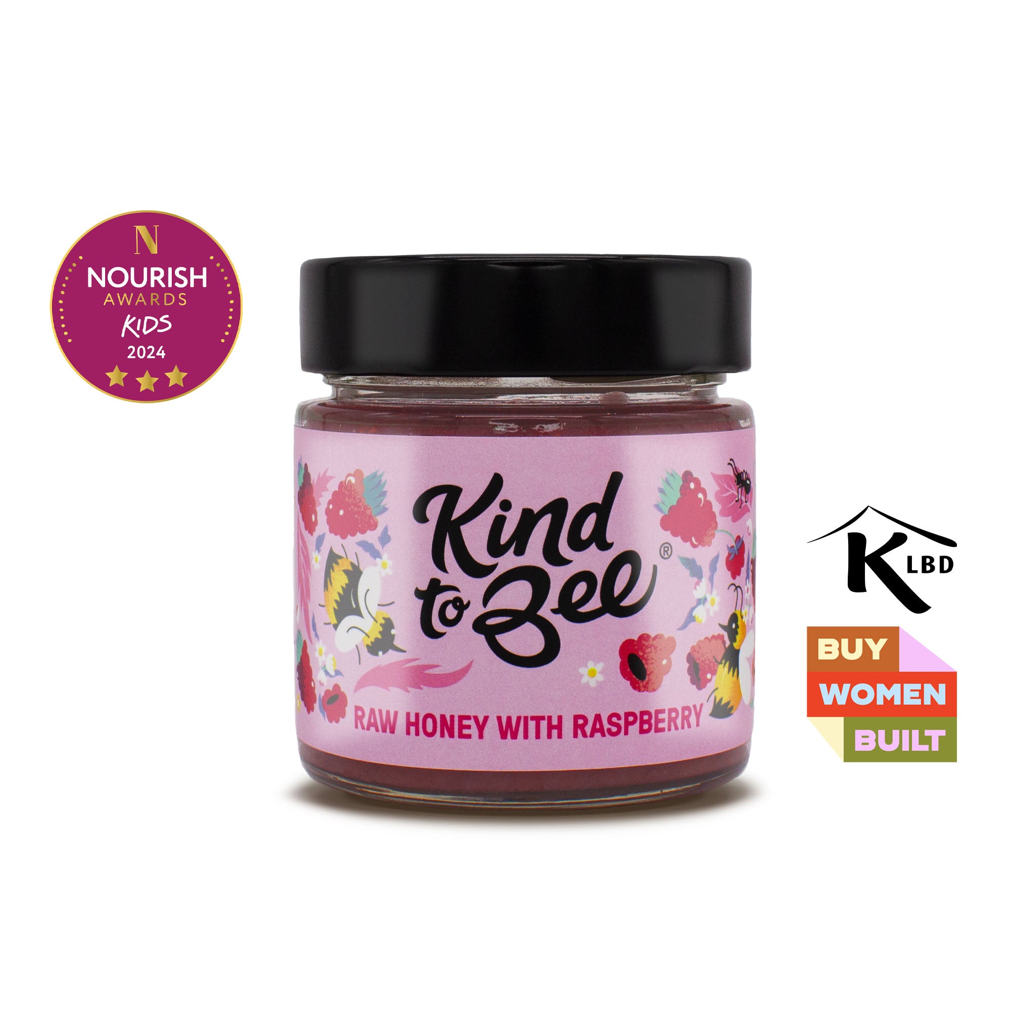 "Tasting notes: Tender & SweetKind to Bee Raw Honey with Raspberry is designed to redefine sweetness with a health-conscious twist. Part of the Innovative Collection, it combines just two ingredients — the finest raw honey and fresh raspberries — to create a deliciously distinctive and one-of-a-kind blend. Lovingly raw, proudly unheated, and completely unprocessed, this is a signature family recipe — naturally brimming with goodness and a delicate charm.Excite your kids with Raw Honey with Raspberry — like a swirl of cotton candy in a jar! Made only with zingy fresh raspberries and lusciously sweet raw honey, this bright pink treat dances on the tongue with its fun, scrumptious flavour. Revel in its floral scent and the nuanced notes of cantaloupe, vanilla, and sun-warmed berries. It’s the smart, sweet choice — cherished by kids and parents alike. Guaranteed to make snack or mealtime the highlight of the day!Kind to Bee Raw Honey with Raspberry crowned the ultimate winner of the Nourish Kids Awards 2024.It is KLBD kosher certified — a gold standard for ethical, healthy, and conscientious food production, and a trusted mark for those seeking quality and transparency, including those following religious diets, vegetarians, individuals with dairy sensitivities, and anyone choosing GMO-free, organically produced, high-integrity foods.Kind to Bee stands as a beacon of ethical and sustainable practices. Its cruelty-free harvesting gathers only surplus honey, ensuring the well-being of the bees and the continuity of natural prosperity. The bees thrive in a pure and natural environment with thoughtful apiary management that embraces a holistic approach. The Kind to Bee team eschews antibiotics, high-fructose corn syrup feeds, and synthetic treatments — prioritising humane bee care and nurturing healthy landscapes.A gift of distinction, Kind to Bee honey is more than unique — it is a royal contribution to bee welfare and to the Earth we all share."