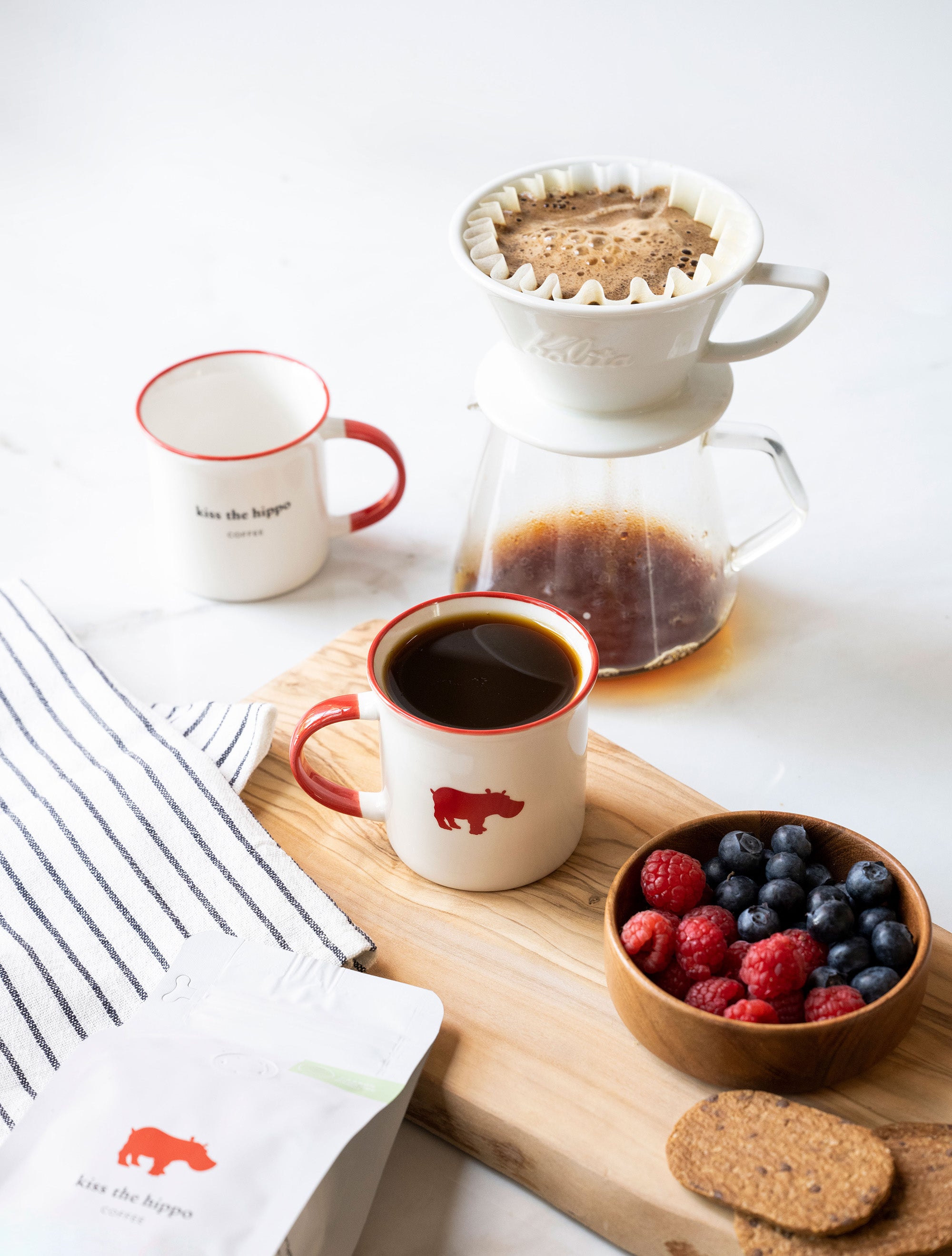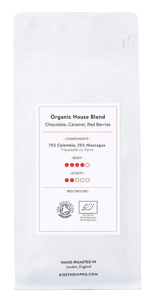 "Two delicious coffees combine for Kiss the Hippo’s Organic House Blend, a carefully-roasted coffee filled with delicate, natural flavour that can be enjoyed alone or is strong enough to shine through milk. Certified Carbon Negative and Organic, this ble"