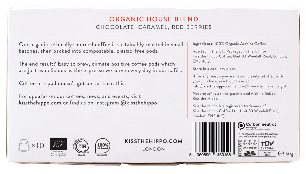 "Enjoy a café-quality coffee break in the comfort of your own home with award-winning, Nespresso® compatible and home compostable coffee pods filled with Carbon Negative and delicious coffee.Carefully roasted to highlight the coffee’s natural flavours, Kiss the Hippo's fan-favourite Organic House Blend is a crowd-pleasing combination of sweetness and balance: delicious on its own, but robust enough to shine through milk – with tasting notes of chocolate, caramel and red berries"