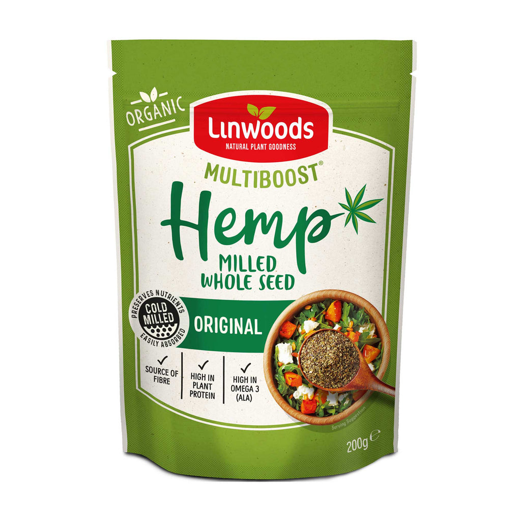 "100% organic milled whole hemp seed.High in plant protein, source of fibre, high in omega 3 (ALA). Tastes great when you add 25g (2 dessertspoonfuls) to your meals. Use it in yoghurt, over fruit, blend into a smoothie or use as a topping for breakfast."