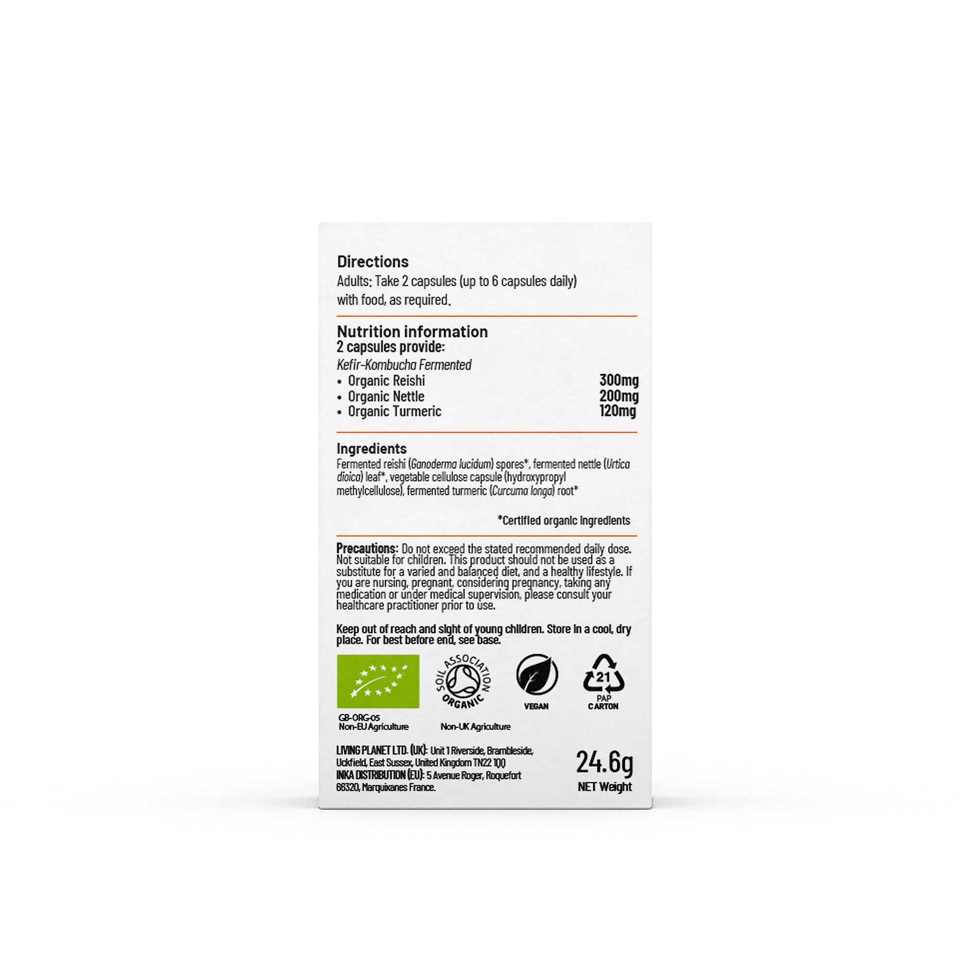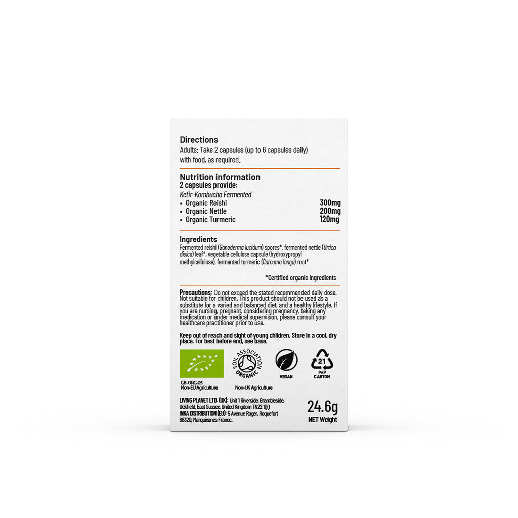 "Living Nutrition’s Organic Fermented Aller-Plex is a blend of reishi spores, nettle, and turmeric for allergies, hay fever and immune balance.These traditional herbs and medicinal mushrooms are rich in valuable micronutrients, enzymes, and full-spectrum compounds which work holistically together to balance immune response and help with seasonal and environmental allergies. The unique kefir-kombucha fermentation transforms the mushroom and herbs into their most living, active state, to create a synergy of bioavailable nutrients, enzymes, and beneficial microbes delivered as a living food complex for balanced immune function and seasonal challenges."