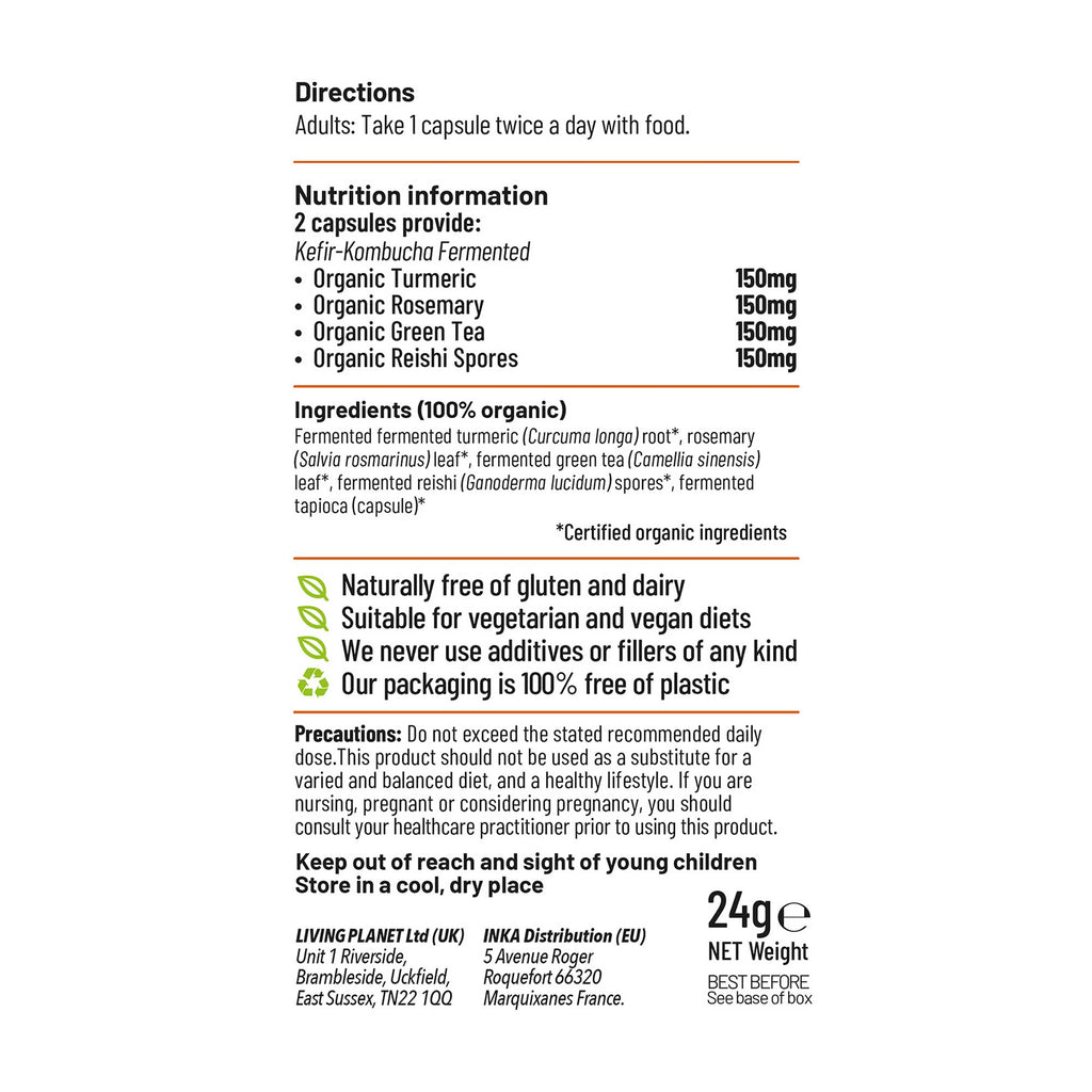 "Living Nutrition’s Organic Fermented Kef-flamex is a blend of powerful herbs turmeric, rosemary, green tea and reishi spore for physical health and wellbeing. These traditional herbs are rich in valuable micronutrients, enzymes, and full-spectrum compounds which work holistically together to support the health and wellbeing of the body’s joints and tissues. The unique kefir-kombucha fermentation transforms these herbs into their most living, active state, to create a synergy of bioavailable nutrients, enzymes, and beneficial microbes delivered as a living food complex for all-round physical support. "