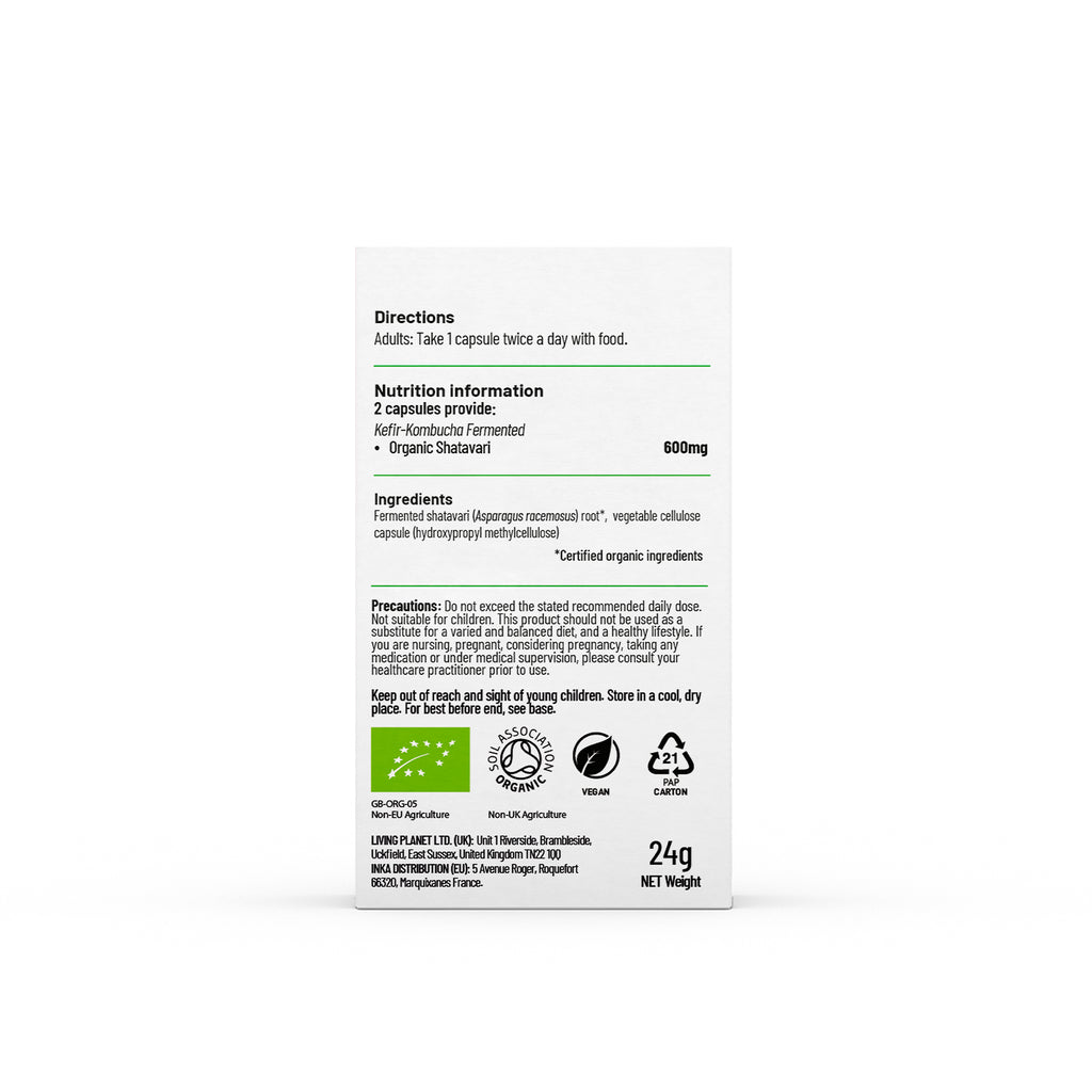 "Shatavari has traditionally been used to support and strengthen reproductive health. It is considered a rejuvenating herb for the female reproductive system and has powerful strengthening and nourishing properties. In Ayurveda, shatavari has been traditionally used as one of the important herbs to support female health through the life cycle.Organic Fermented Shatavari is rich in valuable micronutrients, enzymes, and full-spectrum compounds to bring balance and harmony to the body and mind and support overall wellbeing. Shatavari is also a natural adaptogen and can play an important part in a healthy approach to stress management."