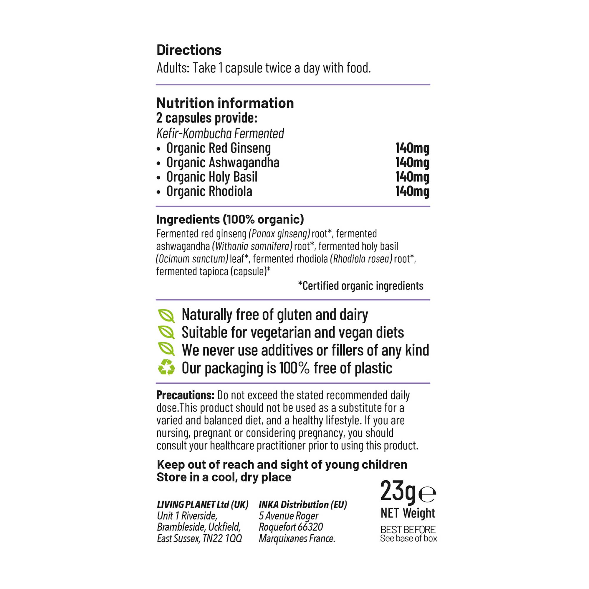 "Living Nutrition’s Organic Fermented True Adaptogens is a blend of the most revered and powerful adaptogens red ginseng, ashwagandha, holy basil, and rhodiola to balance body, mind, and spirit. These powerful herbal adaptogens are rich in valuable micronutrients, enzymes, and full-spectrum compounds which work holistically together to bring balance and harmony to the body during demanding periods. Fermenting maintains adaptogenic integrity by taking the whole of the plant and creating a superior form of the adaptogen, bursting with life and vitality. The unique kefir-kombucha fermentation transforms these herbs into their most living, active state, to create a synergy of bioavailable nutrients, enzymes, and beneficial microbes delivered as a living food complex for all-round adaptogenic support."