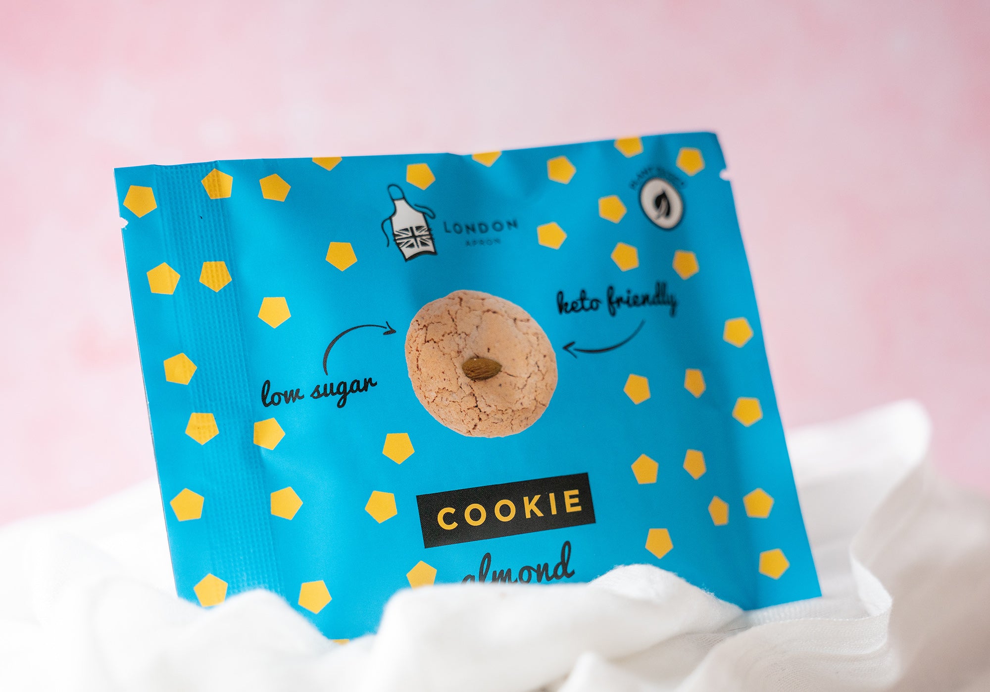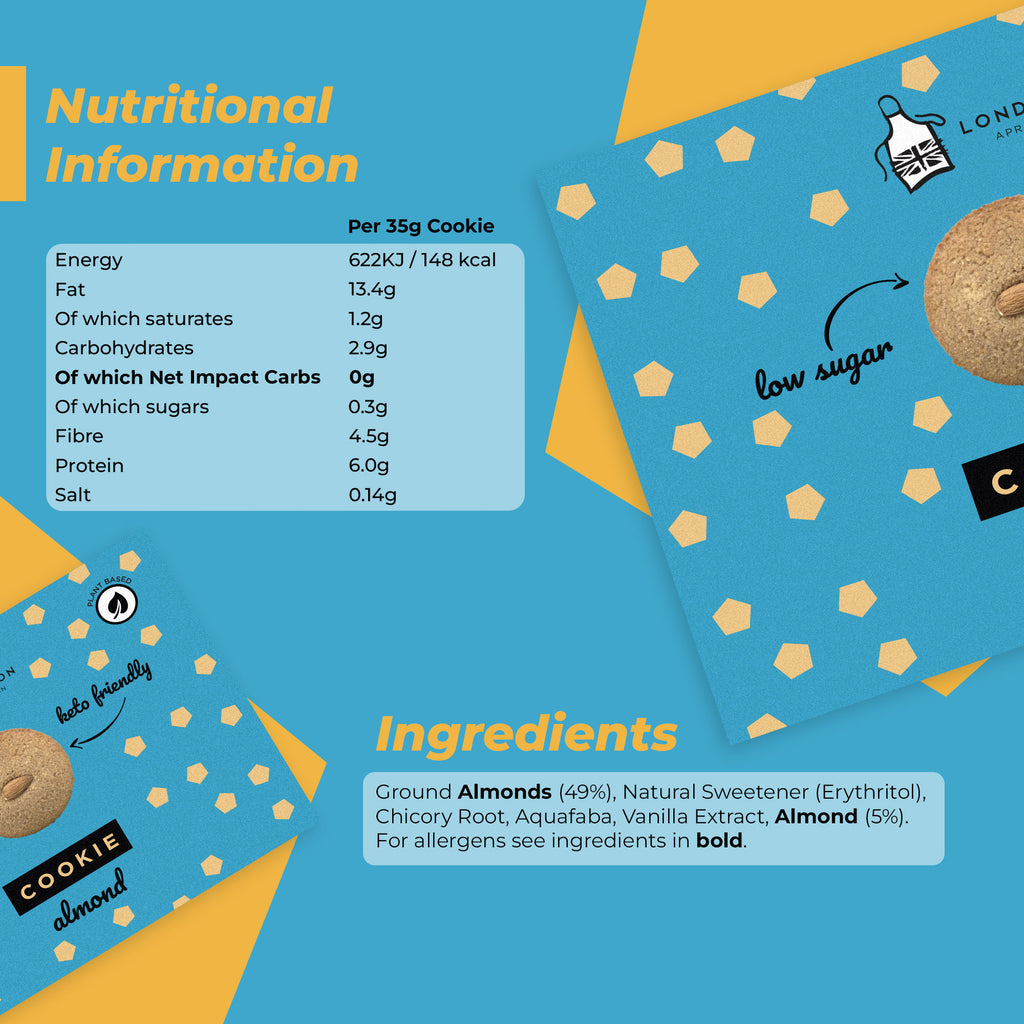"London Apron keto-friendly almond cookie is a delightful low carb treat. With 0g Net Carbs, high protein, low sugar, and plant-based goodness, they're a delicious choice made with a handful of wholesome ingredients"