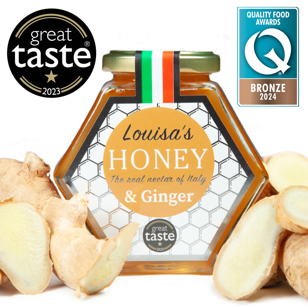 "Pure, natural, raw Acacia honey infused with 1% Root Ginger. Sustainably sourced honey from bee farms that are located in the beautiful valleys of Italy. Using only traditional and natural methods. Bees are never treated with unnatural products or chemicals. Louisa's Honey is Lab tested to verify authenticity and to ensure it is of the highest quality, standard and purity! Tested and certified by one of the world's leading experts in the analysis of honey.Louisa’s Multi Award Winning Acacia honey with Ginger is a speciality infusion. Pure and natural Acacia honey, where by the bees collect the nectar from the Acacia flowers to produce Acacia honey. The real nectar of Italy! To achieve a unique Acacia with Ginger flavour it is infused with 1% natural Root Ginger (a flowering plant). Unique sweet and floral flavour followed by a ginger, spicy and warm lasting aftertaste. Releasing a delightful warm Ginger aroma.Louisa’s Acacia & Ginger honey is liquid gold in colour and remaining a liquid consistency for a long period of time.Acacia Honey and Ginger Honey is antibacterial, great immune boost and soothing if you have flu symptoms. It is a great source of natural energy too! Perfect for athletes. This is a very popular honey because of the additional health benefits that the root of the Ginger brings. Multi Award Winning! Awards:2024 Quality Food Award 2023 Great Taste 1 Star "