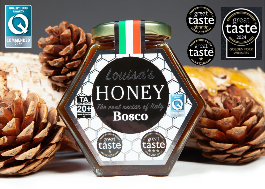 "Pure, natural and not infused Italian Premium Honey. Sustainably sourced honey from bee farms that are located in the beautiful valleys of Italy! Using only traditional and natural methods. Bees are never treated with unnatural products or chemicals. Louisa's Honey is Lab tested to verify authenticity and to ensure it is of the highest quality, standard and purity! Tested and certified by one of the world's leading experts in the analysis of honey.Louisa’s Multi Award & Golden Fork winning Bosco honey, also known as Forest honey is unique, bees create this honey with a sweet substance called honeydew.Producing a very strong and almost malty flavour that is not very sweet in comparison with other honeys. It is very dark Amber in colour, which is shaded brown. It almost never crystallizes, staying liquid for a very long time. Crystallisation is irregular.Louisa’s Bosco honey is one of the rarest and most complex honeys in the world. Unlike our other honeys that come from pollen and nectar, gathered by the bees from flower blossom. Rather, bees create this unique honey from honeydew. A substance produced by Aphids. Aphids deposit droplets of honeydew sap that bees collect from the leaves of Alpine trees of Linden, Fir and Oak. It is because of this unique process that Bosco is a high energy honey, the richest in minerals and enzymes, making it is an excellent supplement for athletes! Louisa’s Bosco Honey TA Score: 20+ / Comparative to 829 + MGO.The Total Activity (TA) score refers to the bacterial killing scale, the higher the TA, the greater the antimicrobial strength (how good it is at killing bacteria). Total Activity over 10+ are considered to have substantial antimicrobial properties.Comparisons between TA / UMF / MGOLouisa’s honey is tested for its bioactivity via a Total Activity or TA rating. This is similar to the UMF/MGO rating for Manuka honey; however, TA ratings are a measure of both Peroxide Activity (PA) as well as Non-Peroxide Activity (NPA). UMF or MGO ratings refer to Methylglyoxal and is a measurement of only NPA found in Manuka honey.Take a look at the comparison chart for TA rating to MGO. TA MGO5+ 8310+ 26312+ 35415+ 51418+69220+82930+100040+1250 50+1500 Multi Award Winning! Awards: 2024 Great Taste Award Golden Fork Winner & Great Taste 3 Stars.2023 Great Taste Awards 1 Star.2022 Quality Food Award Commended."