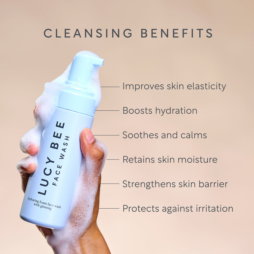 Notify Me When Available"Clean the skin and remove daily impurities, dirt and grime. This hydrating Face Wash helps keep skin hydrated and conditioned, nourished and refreshed. It has the consistency of silky mousse and doesn’t strip the skin,. Containing: Ginseng to moisturise and boost hydration to help improve skin elasticity and the appearance of fine lines and wrinkles; Rose flower water to soothe calm and help protect the skin; Natural betaine to help hydrate and strengthen the skin barrier; Calendula to soothe and moisturise dry and chapped skin; Glycerin to help condition and protect the skin. Over 200 pumps per bottle, 1-2 pumps per use. Dermatologically approved suitable face wash for sensitive skin. Suitable for use in pregnancy and breastfeeding. SLS free. pH 5.45-6. 100% palm oil free. Certified COSMOS Natural, Cruelty Free and Vegan. An Ethical Best Buy with the Ethical Consumer Magazine. Made in the UK. 100% PCR plastic bottle. "