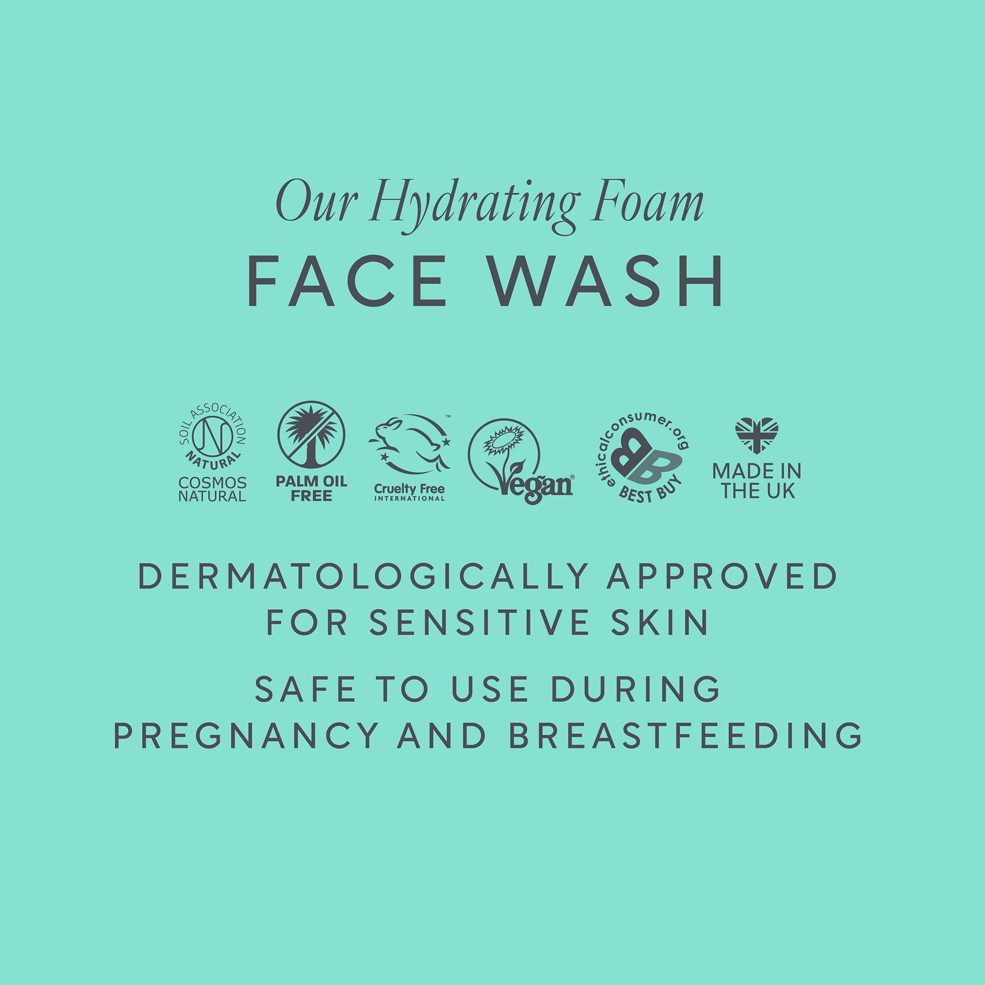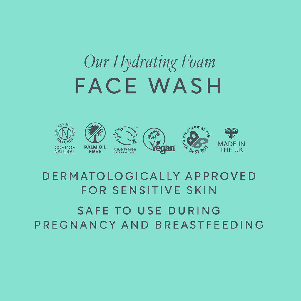 "Clean the skin and remove daily impurities, dirt and grime. This hydrating Face Wash helps keep skin hydrated and conditioned, nourished and refreshed. It has the consistency of silky mousse and doesn’t strip the skin,. Containing: Ginseng to moisturise and boost hydration to help improve skin elasticity and the appearance of fine lines and wrinkles; Rose flower water to soothe calm and help protect the skin; Natural betaine to help hydrate and strengthen the skin barrier; Calendula to soothe and moisturise dry and chapped skin; Glycerin to help condition and protect the skin. Over 200 pumps per bottle, 1-2 pumps per use. Dermatologically approved suitable face wash for sensitive skin. Suitable for use in pregnancy and breastfeeding. SLS free. pH 5.45-6. 100% palm oil free. Certified COSMOS Natural, Cruelty Free and Vegan. An Ethical Best Buy with the Ethical Consumer Magazine. Made in the UK. 100% PCR plastic bottle. "