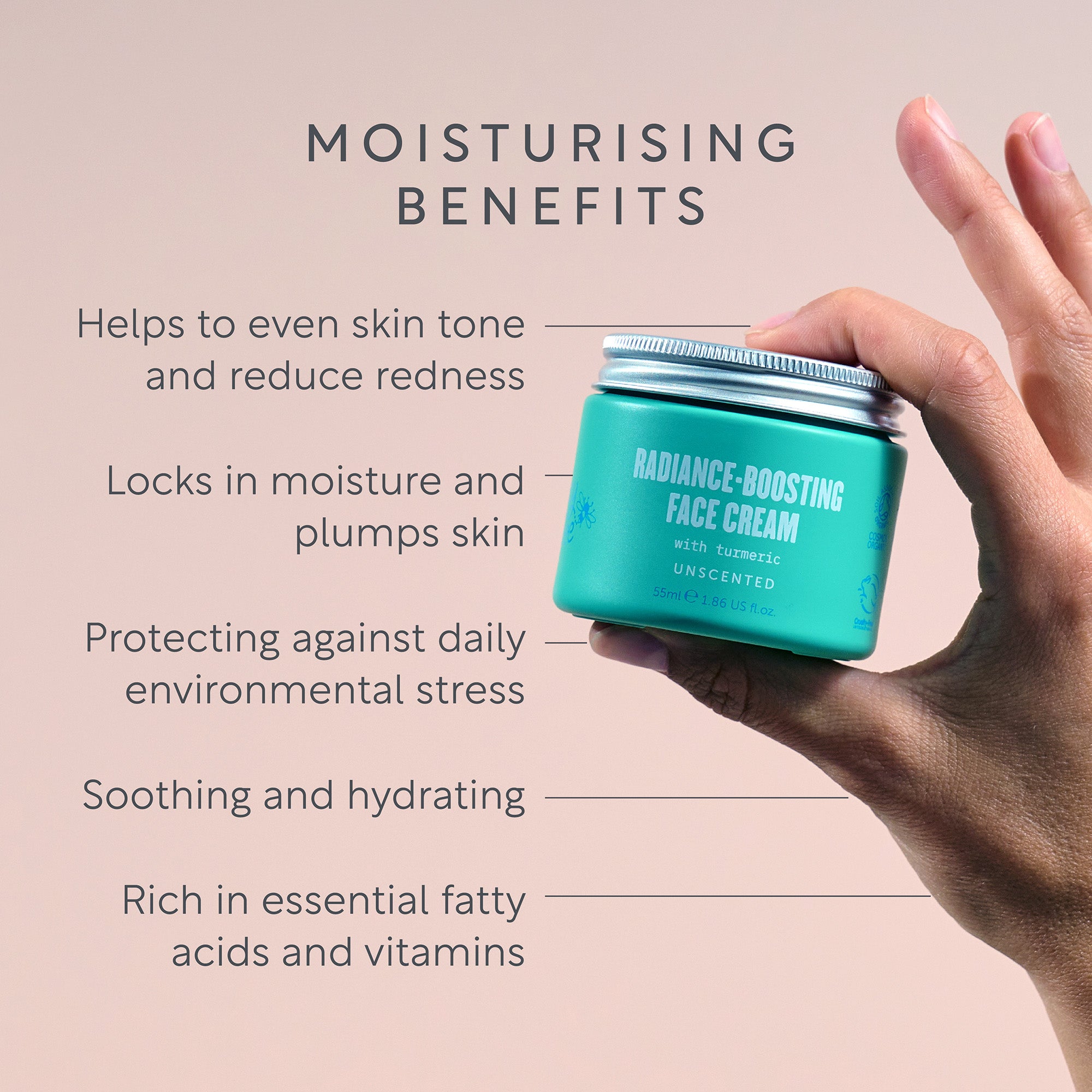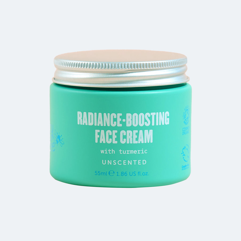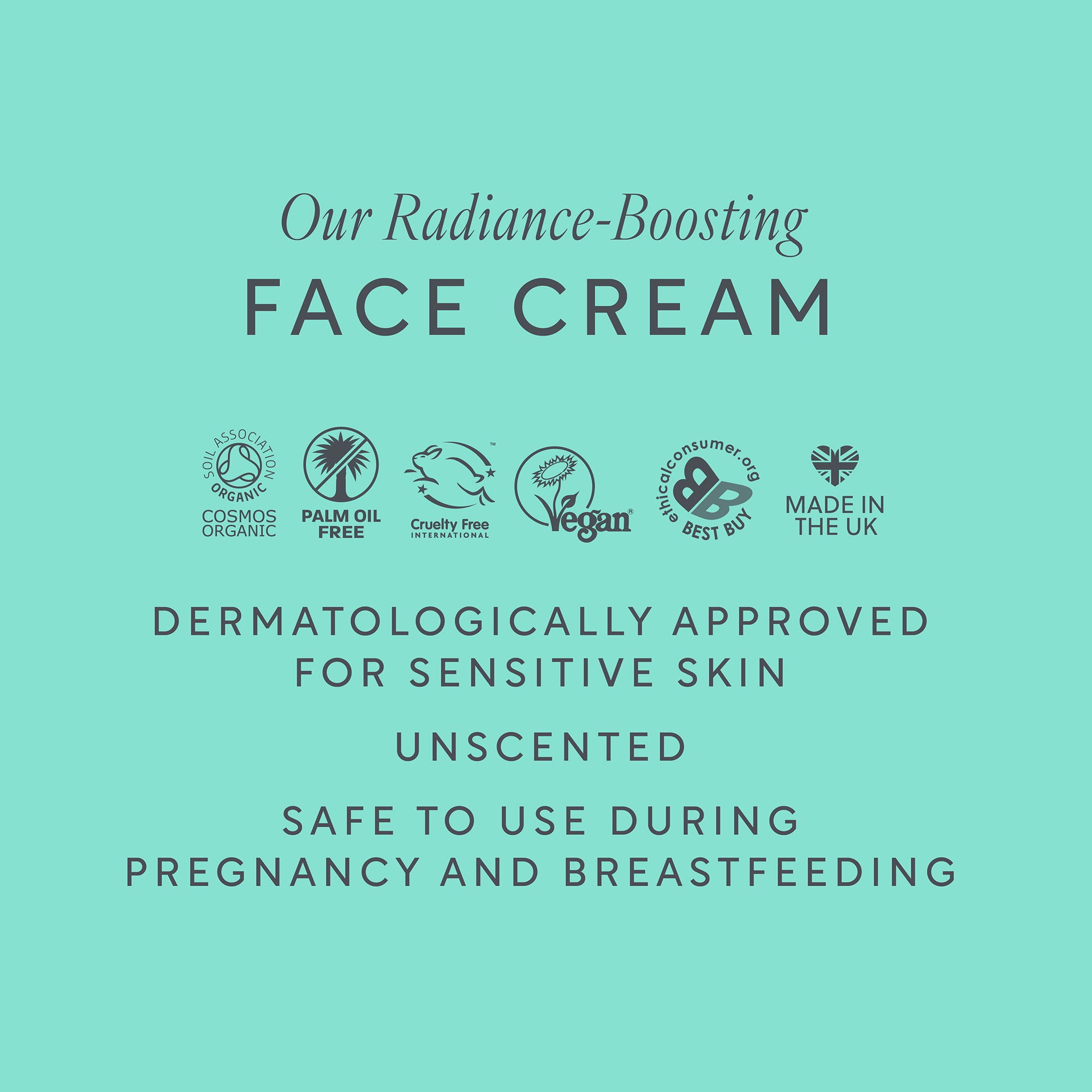 "A hydrating and moisturising fragrance free organic face cream to enhance the skin's natural radiance. Helps to even skin tone and rejuvenate dull-looking skin. Dermatologically approved for sensitive skin. Suitable for use in pregnancy and breastfeeding. Contains Sodium hyaluronate for anti-ageing; Turmeric to help reduce redness; antioxidant Vitamin E. Certified COSMOS Organic, Cruelty Free and Vegan. An Ethical Best Buy with the Ethical Consumer Magazine. 100% palm oil free. Made in the UK. Glass jar and aluminium lid."