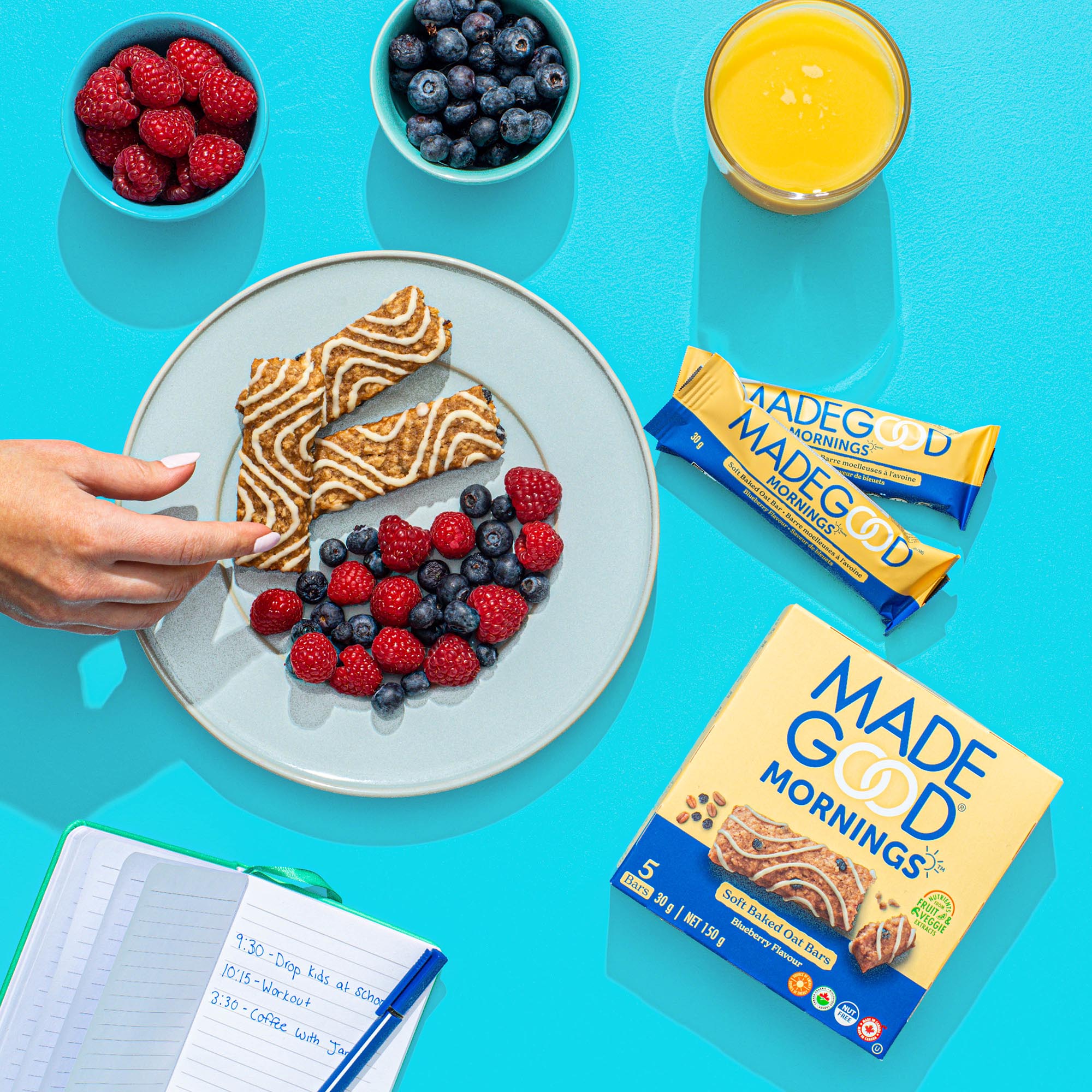 "Mornings may be busy, but they can always be yummy. MadeGood Mornings Blueberry Soft Baked Oat Bars are soft, chewy and just the right amount of sweet. Decadently topped with a vegan white chocolate drizzle. Baked with all organic ingredients, gluten-free oats and free from all the most common allergens. Grab one and get on with your day!"
