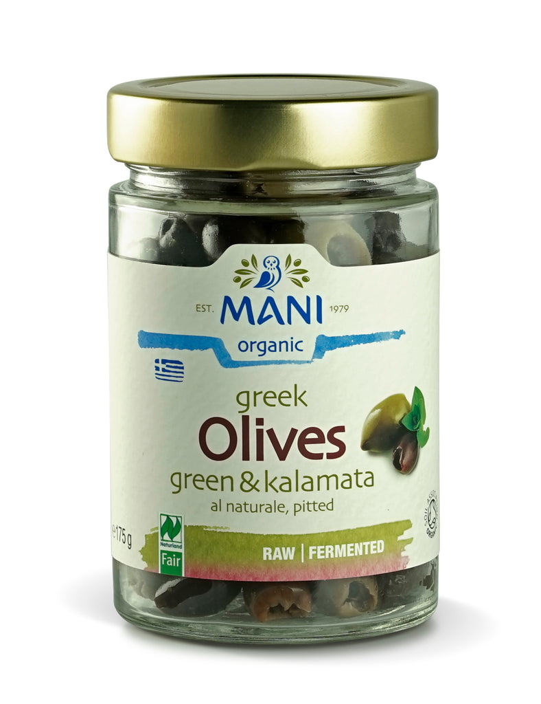 "The best of both: a mix of fruity Kalamata and spicy green Konservoeliá olives. The olives once harvested by hand, are naturally cured for six months and marinated in MANI extra virgin olive oil and aromatic oregano. Pairs perfectly with goats’ cheese, ripe tomatoes and Greek feta."