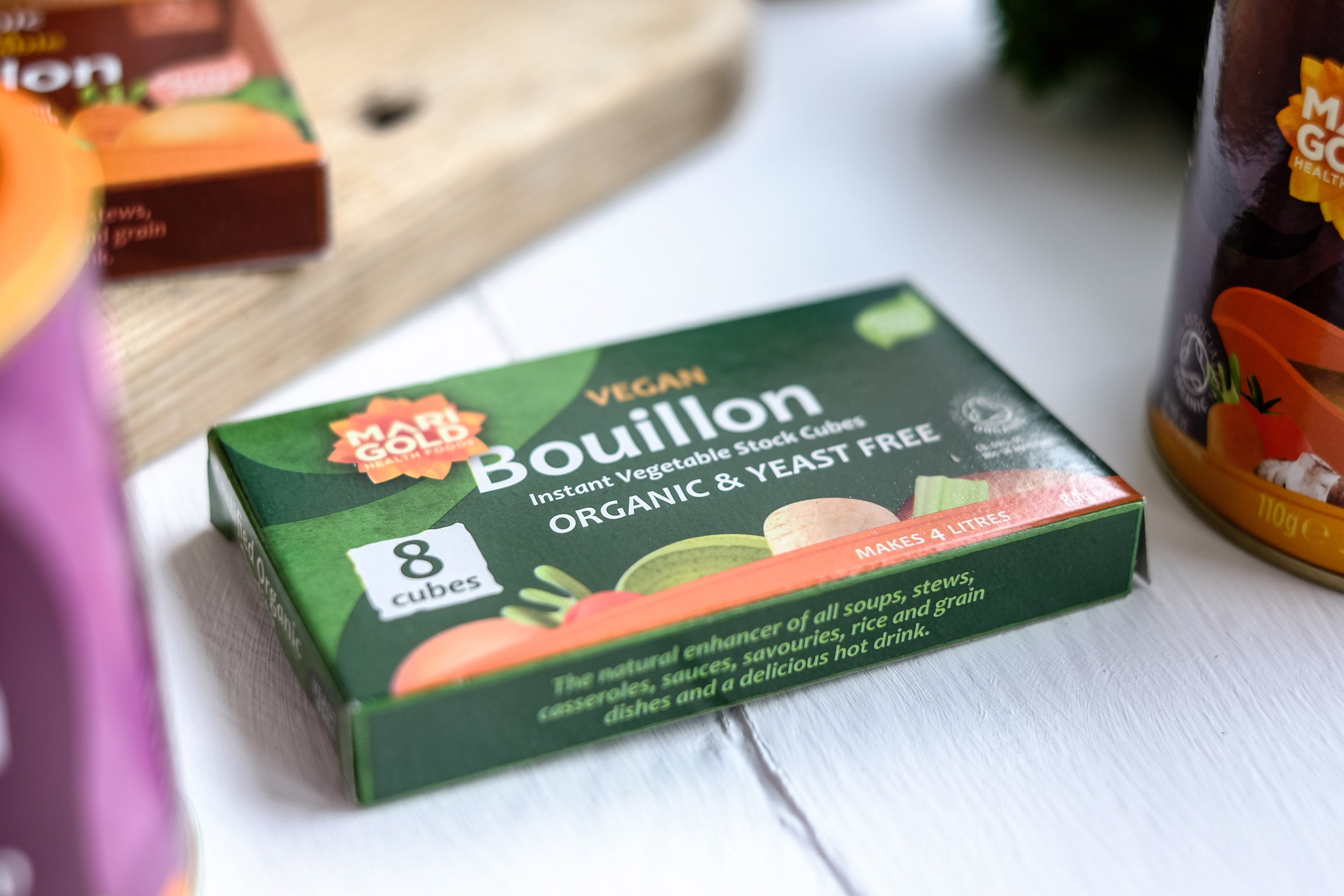 "Marigold’s stock cubes are instantly soluble in hot water and provide a tasty, convenient way to add flavour to any soup, stew or sauce. Simply - Organic, yeast free Marigold bouillon in a cube. Just add to any dish while cooking and stir well to boost the flavour. No allergen containing ingredients. Vegan. Gluten free. Palm oil free."