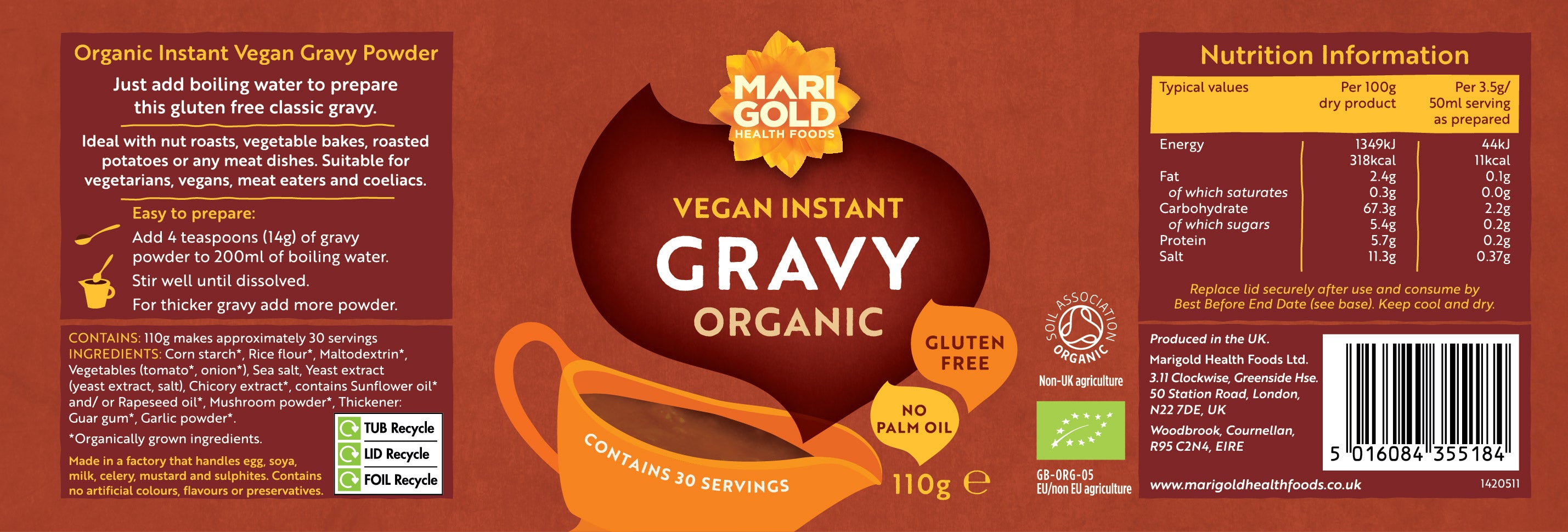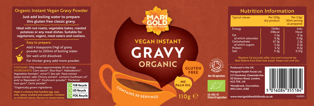 Notify Me When Available"Marigold’s rich gravy is ready in seconds and provides the perfect accompaniment to roast potatoes, sausages and mash, nut roasts or any vegetable or meat dishes. Made from a few selected organic ingredients this rich gravy works equally well for traditional dishes or modern cooking. Instantly prepared. Hearty flavour. Organic. Vegan and gluten free. No palm oil. No allergens containing ingredients"