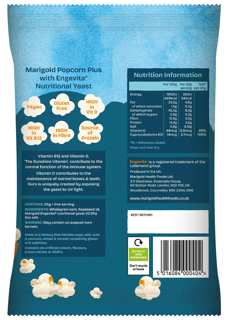 "Marigold Popcorn Plus is the new way to ‘snack healthy’ without compromising on great taste. Marigold has put its own stamp on snacks by creating flavoursome treat with health benefits. Sprinkled with a healthy dose of Engevita nutritional yeast and a pinch of sea salt, Marigold Popcorn Plus delivers a satisfying cheezy tasting popcorn with many added benefits. High in vitamin B12. High in vitamin D. High in fibre. Packed in a convenient 20g bag with only 94kcal. It’s vegan, too. Healthy snacking has never tasted so good!"