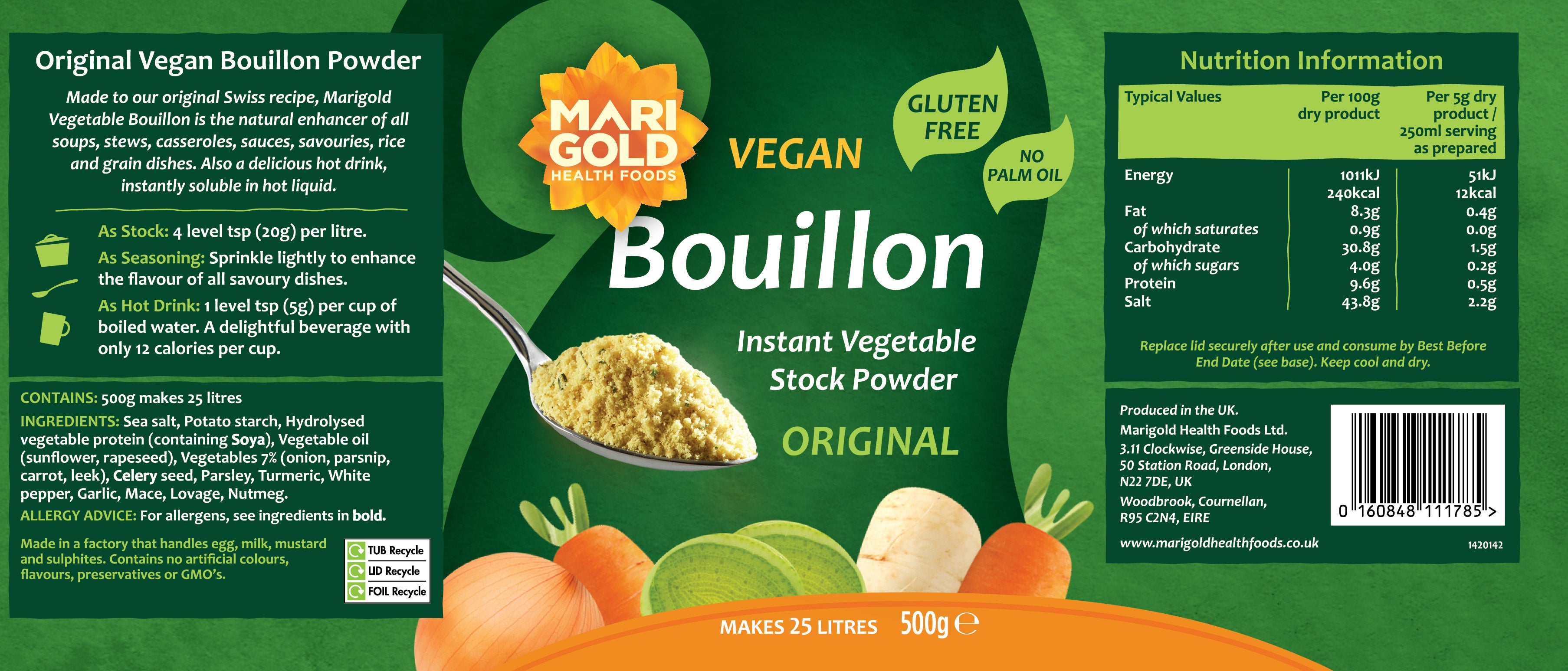 "Marigold’s flavoursome bouillon has been made to a traditional Swiss recipe for decades. Convenient and delicious – Marigold bouillon is used by many a chef – in homes as well as restaurant kitchens. Ideal to enhance the flavour of soups, stews, casseroles, sauces, rice dishes (or even as a hot drink). The most popular Marigold Bouillon, made to the original Swiss recipe. Flavoursome and versatile. Instantly prepared. “If there were good ingredient awards, this would win first prize.” – Delia Smith. Natural ingredients. No nasties. Only 12 calories per cup as a hot drink. Vegan. Gluten free. Palm oil free. No added yeast. Family size."