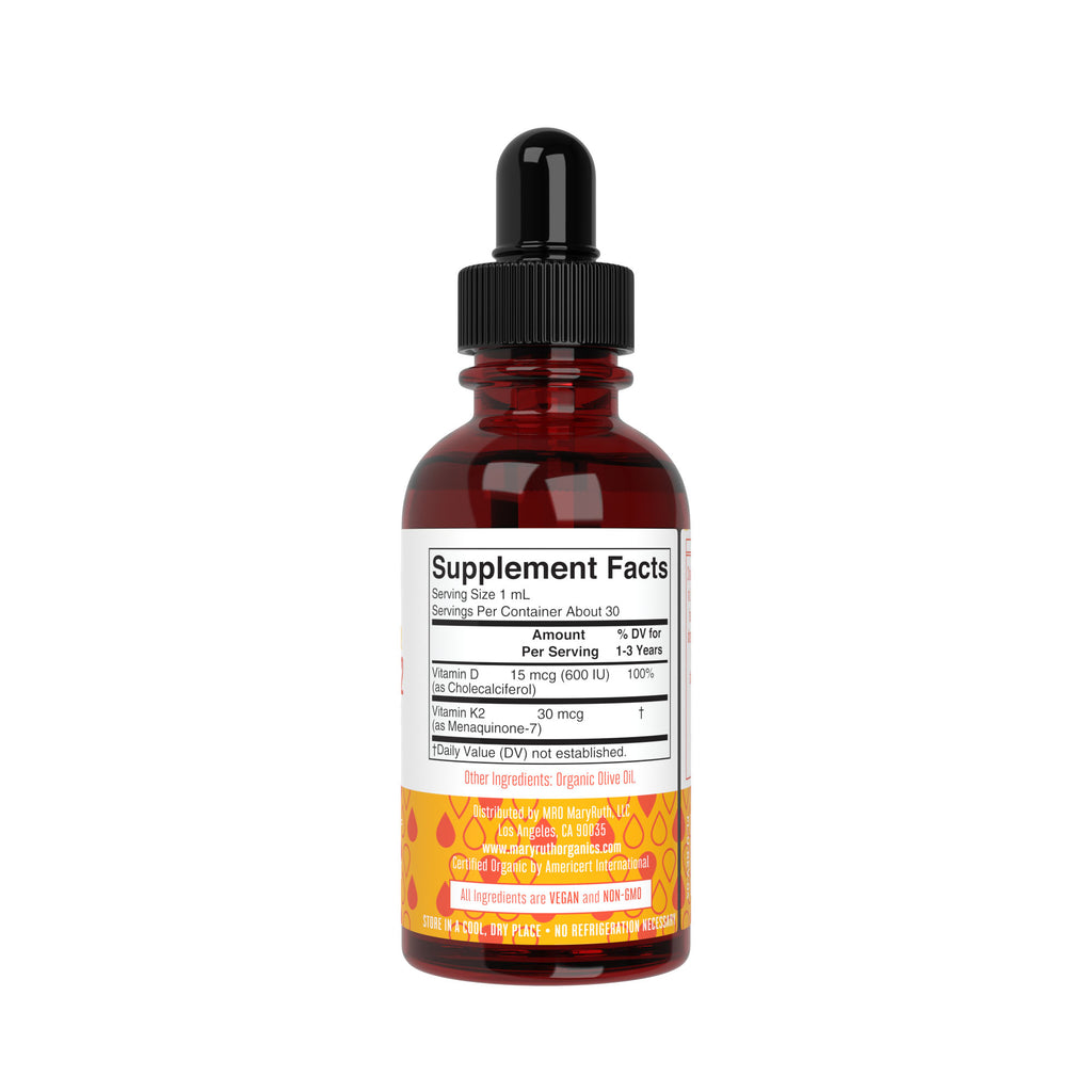 Toddler Vitamin D3+K2 Liquid Drops are formulated to support bone development in young children through a combination of vitamin D3 and vitamin K2. This unflavored liquid supplement provides essential nutrients that work together to contribute to normal b