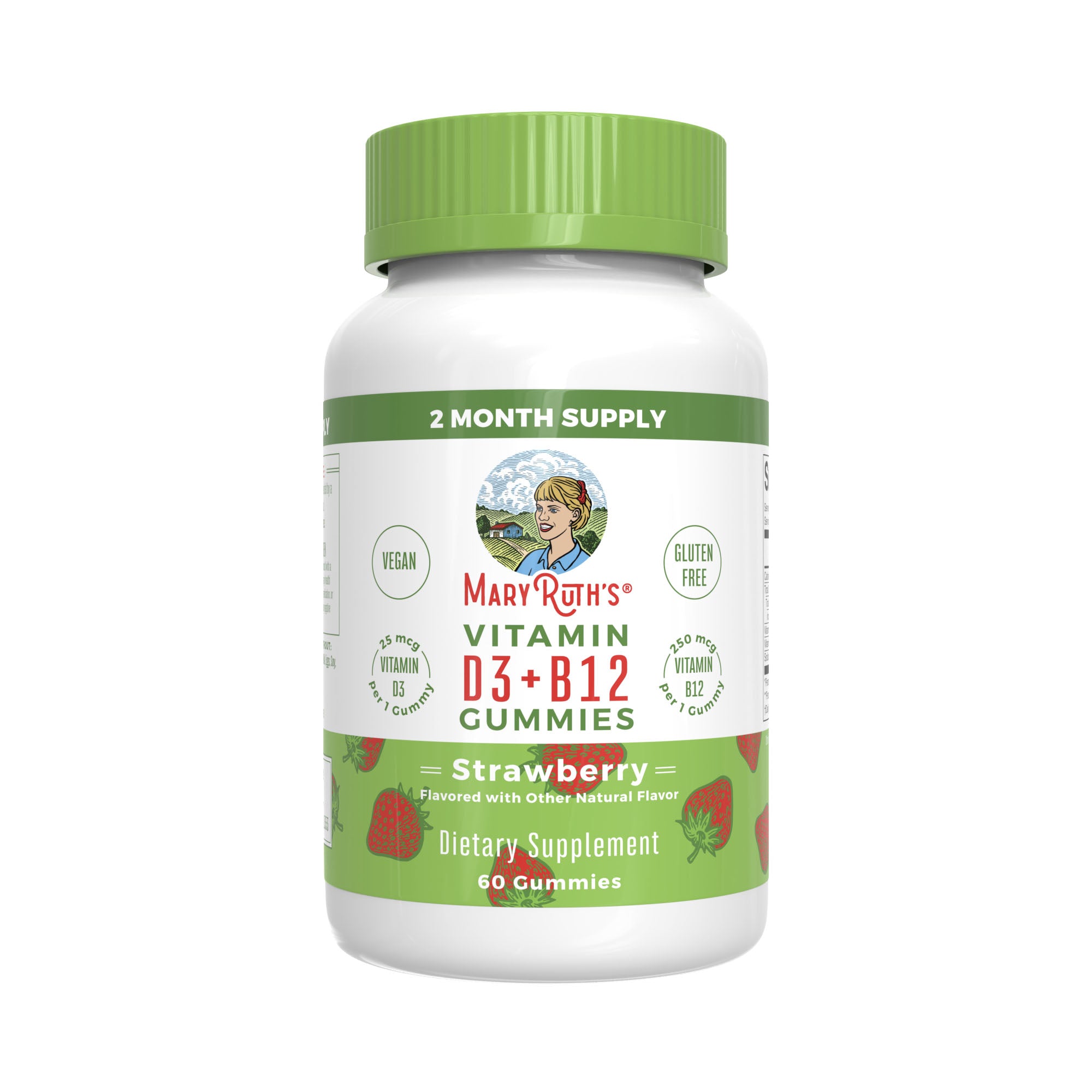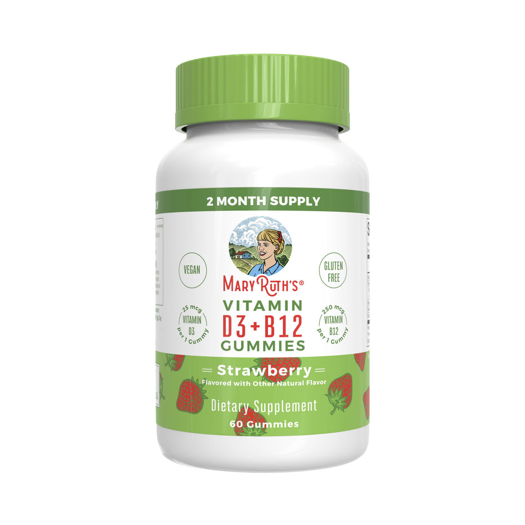 "Mary Ruth's Vitamin D3+B12 Gummies provide 25 mcg (1000 IU) Vitamin D3 and 250 mcg Vitamin B12 per gummy. Each bottle includes 60 strawberry-flavoured gummies. Together, these nutrients support energy metabolism, immune function, cell health, and nervous"