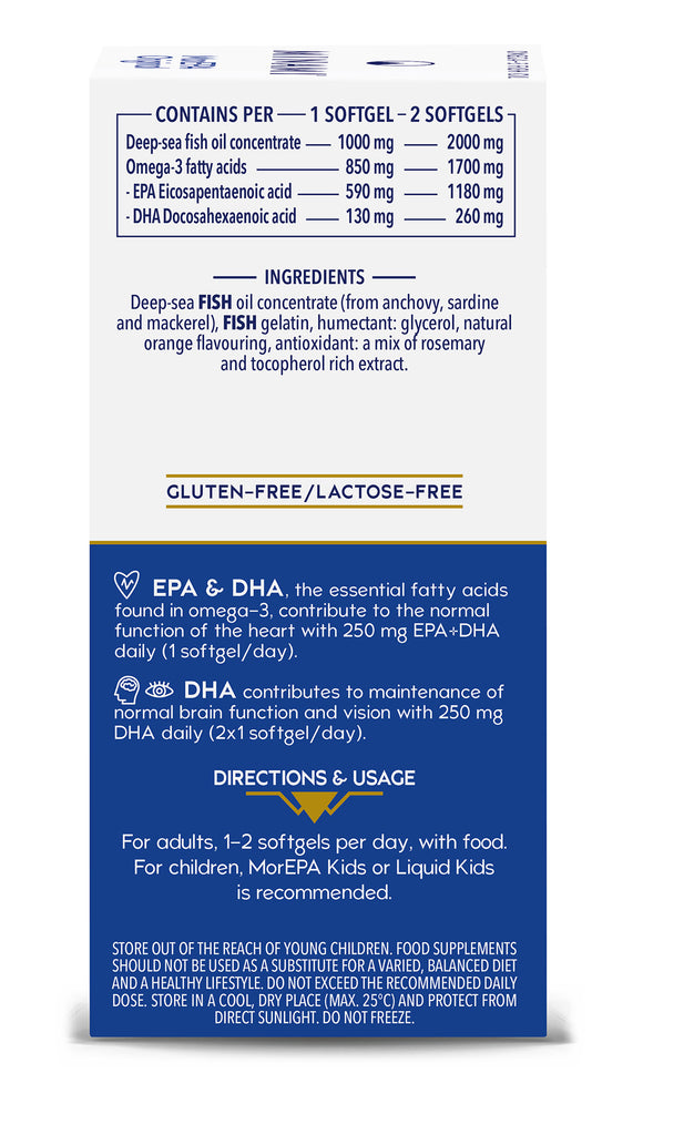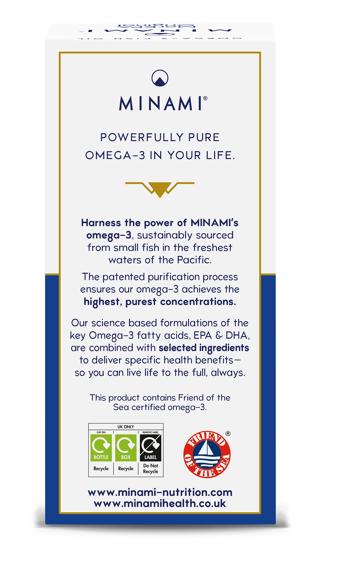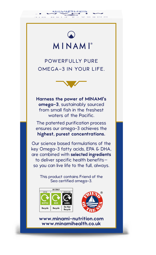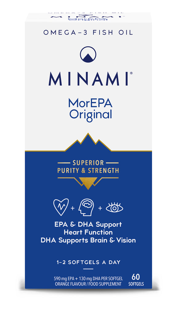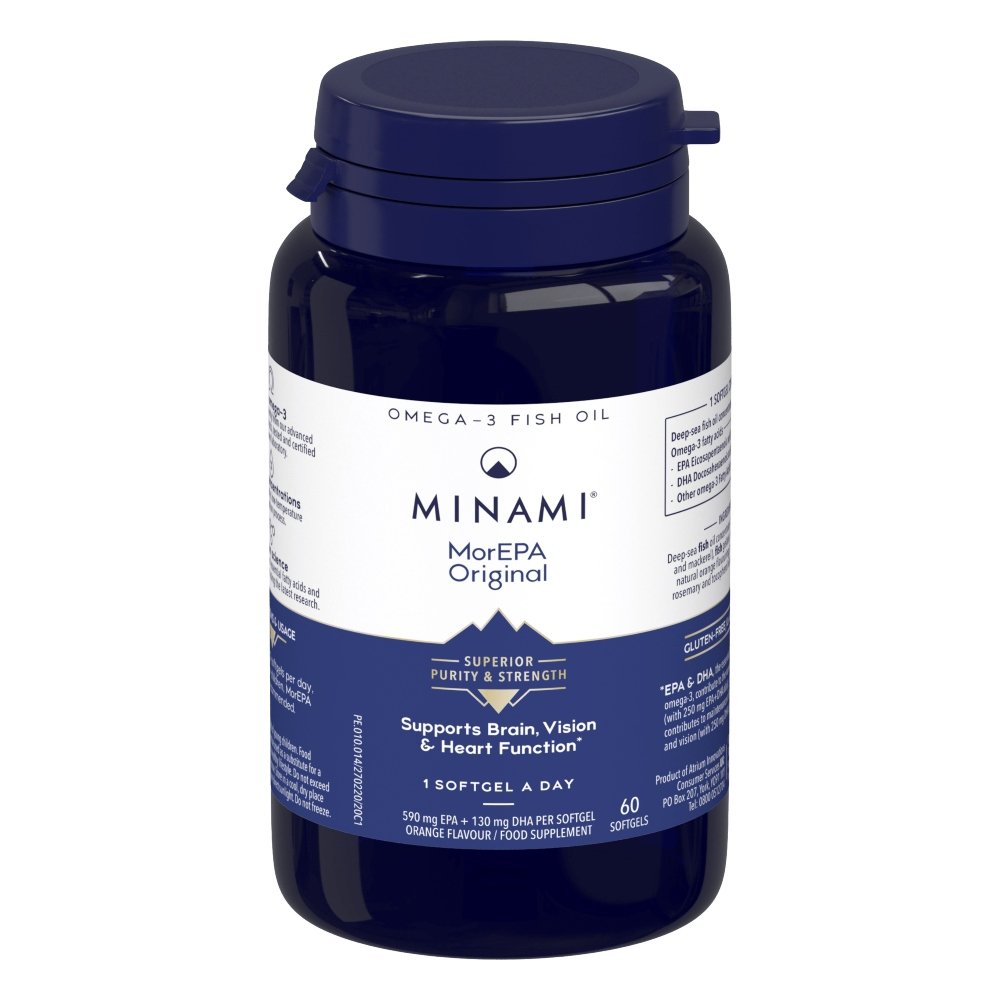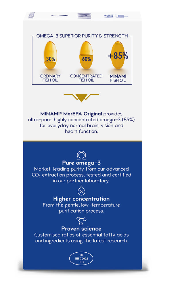 "MINAMI® MorEPA Original provides ultra-pure, highly concentrated omega-3 for everyday vision, brain and heart health. EPA and DHA, the essential fatty acids found in omega-3, contribute to the normal function of the heart (with 250 mg EPA+DHA daily; 1 softgel/day)1. DHA contributes to the maintenance of normal brain function (with 250mg of DHA daily; 2 softgels/day). DHA contributes to the maintenance of normal brain function and vision, (with 250mg of DHA daily: 2 x 1 softgel/day)4 Pure omega-3:Market-leading purity from our advanced CO2 extraction process, tested and certified in our own laboratory. Higher concentration:Higher concentrations from our gentle, low-temperature purification process.Proven science:Customised ratios of EPA, DHA and natural ingredients using the latest research. "
