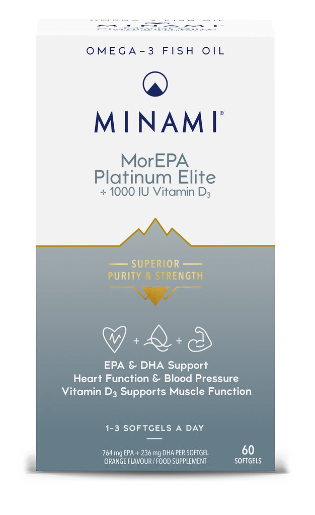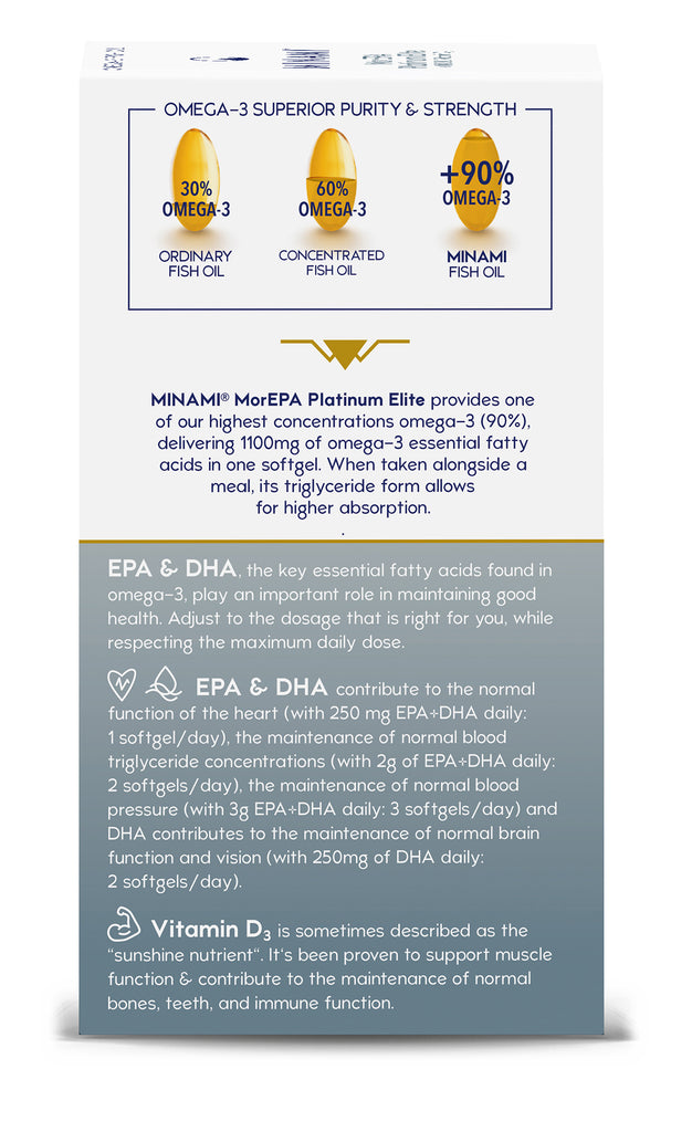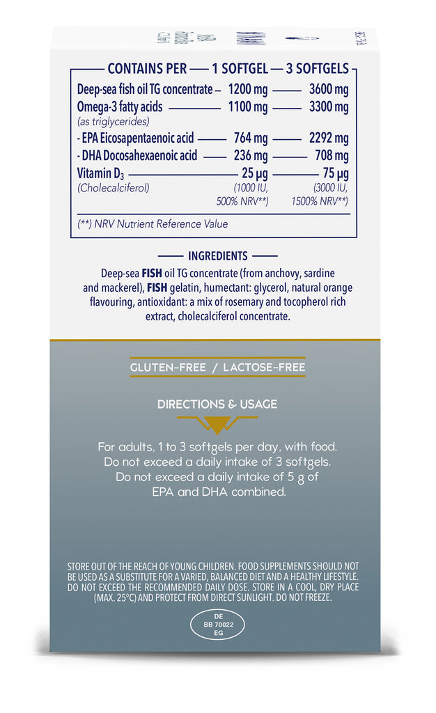 "High Concentration Pure Omega-3 to Support Heart, Blood Pressure & Muscle Function + Vitamin D3. 764mg EPA + 236mg DHA per softgel. Orange flavour. 60 Softgels. "