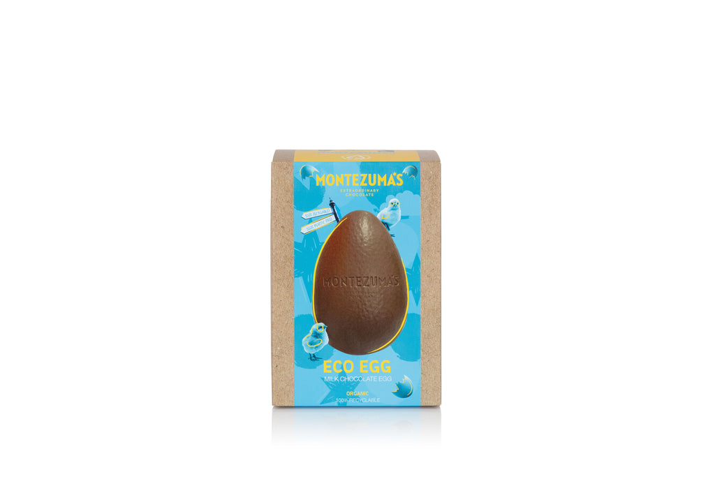 Organic milk chocolate hollow egg packaged in eco friendly 100% recyclable packaging.
