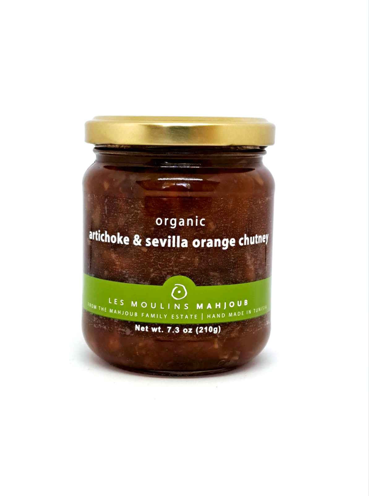 "The Mahjoub chutneys are prepared as a tribute to the sweet and salty flavors of Mediterranean cooking. The Sevilla orange variety is renowned for its sweet aroma, so much so that it is used to produce orange flower water. Orange and artichokes are a classic Tunisian pairing. As with all of the Mahjoub products, these are produced using traditional farming methods with no additives or artificial processes."