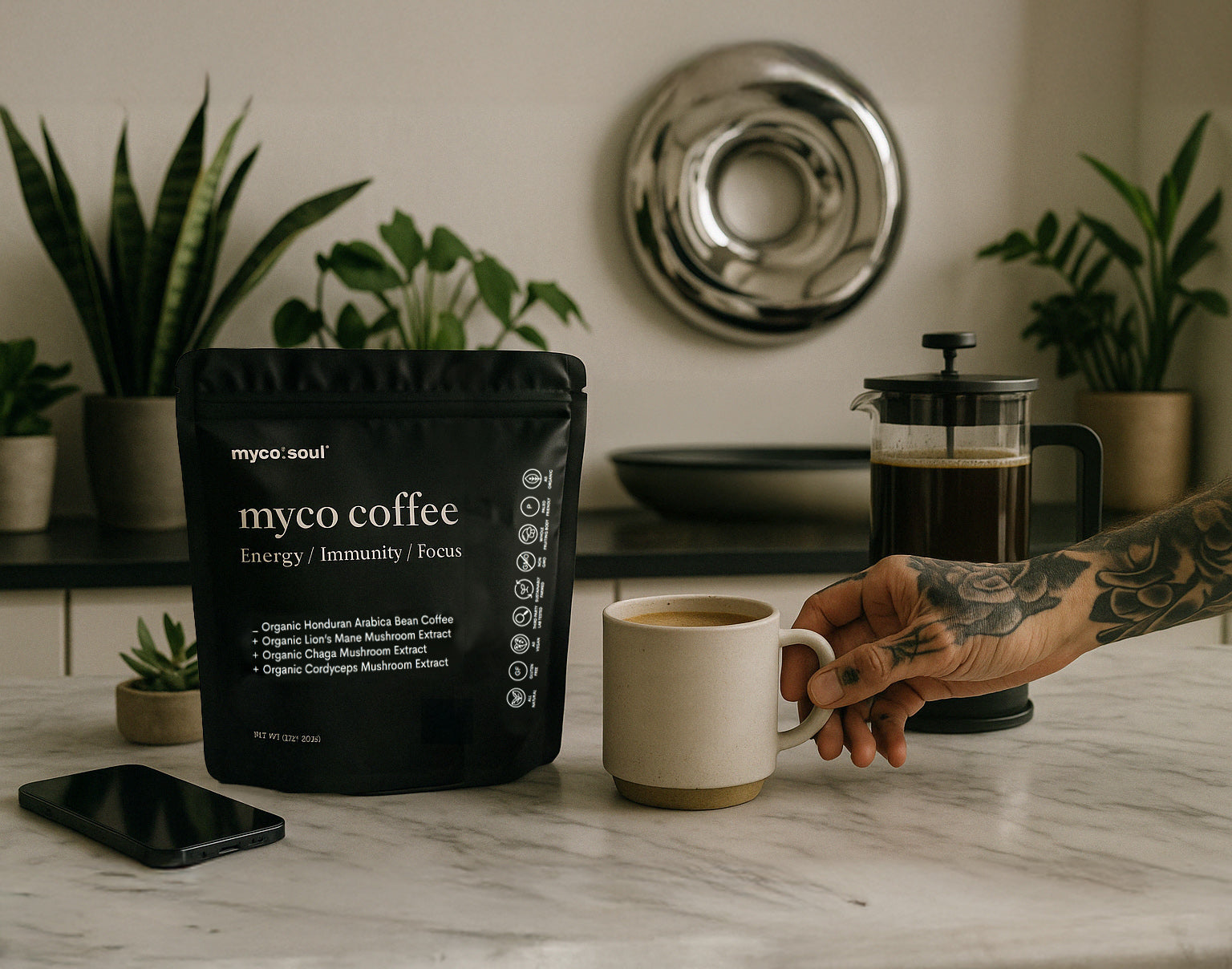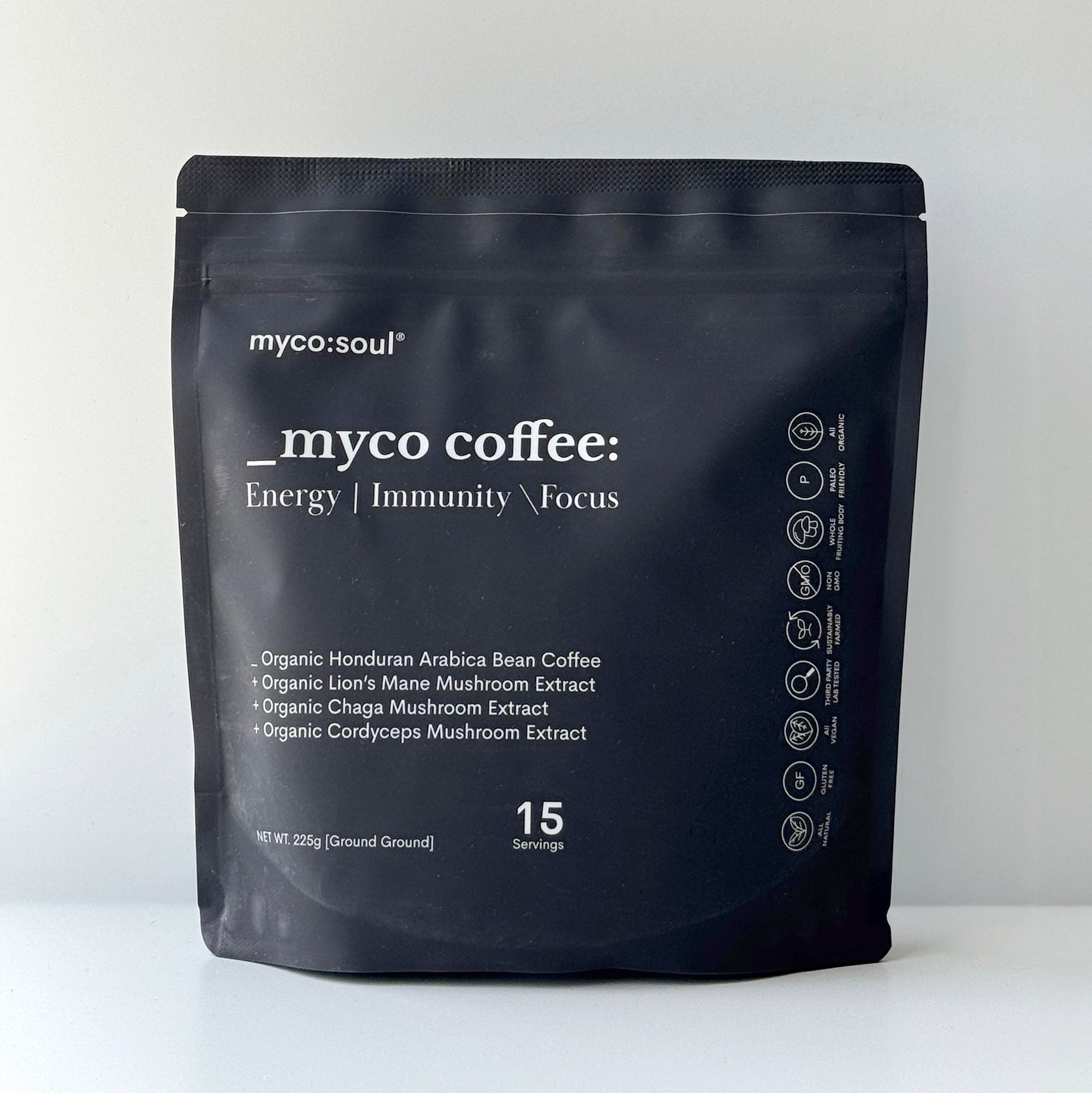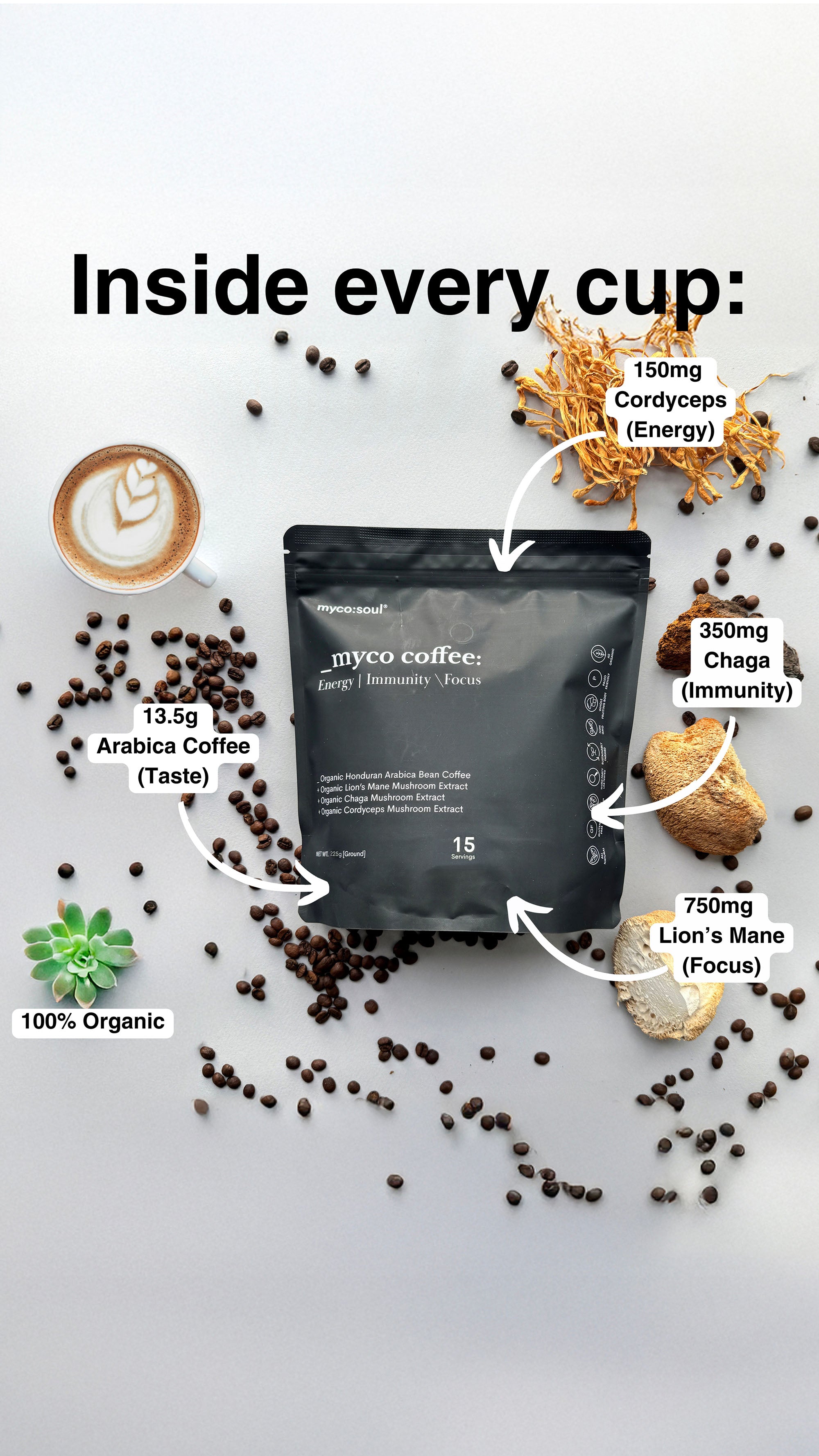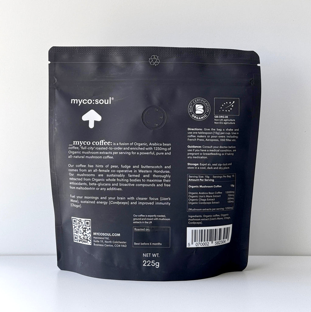"Premium Mushroom Coffee. A smooth, full-bodied blend of Organic Arabica coffee enriched with 1250mg of functional mushroom extracts. Hand-roasted in small batches in the UK. It combines the bold flavour of Speciality Grade dark-roast coffee with carefully selected fruiting body extracts of Lion’s Mane, Cordyceps and Chaga. Made without fillers, maltodextrin, sweeteners or additives, this product offers a clean, 4 ingredient, balanced brew that retains the taste and smell of real coffee with the boost of 3 functional mushroom extracts."