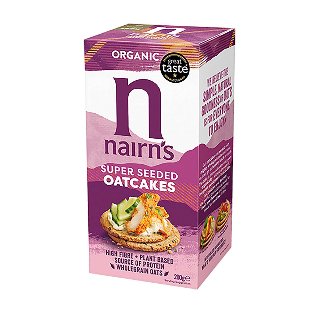 "Our oatcakes are packed with wholegrain oats, and oats contain nutrients which help transform the carbohydrates into usable energy, so they are a great, natural way to help fuel your day. These Super Seeded Oatcakes are also full of delicious flax, sunflower and chia seeds, which makes them even more crunchy and so tasty, you can eat them on their own, without a topping. These seeds are a great natural source of protein, as well as being high in fibre and rich in omega 3 or 6, and ours are all grown organically - so now there are even more reasons to feel good about enjoying our Super Seeded Organic Oatcakes.Naturally organicAt Nairn's we care passionately about the environment. That's why Nairn's Super Seeded Organic Oatcakes not only taste good, they are also full of natural goodness. The oats and seeds baked in this product are grown organically - without the use of pesticides or insecticides. This allows the crop to thrive naturally and also helps encourage soil fertility. Even our cartons come from sustainable forests, so you can enjoy our Organic Oatcakes knowing that they are good for you and good for the environment."