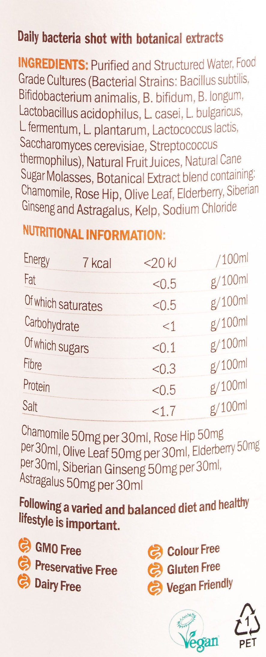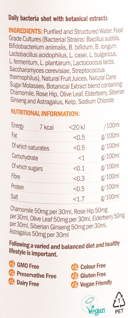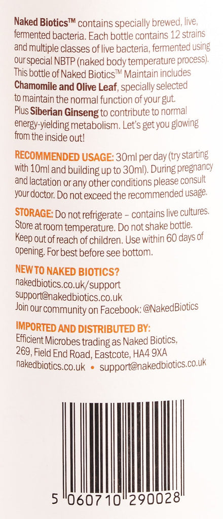 "Naked Biotics Daily Maintain is a liquid probiotic shot that contains specially brewed, live bacteria and selected botanicals, for supporting a normal immune system. Each bottle contains 12 strains and multiple classes of bacteria that have been fermented for 21 days. The bacteria in Naked Biotics are strong, adaptable and able to reach the digestive system alive. Naked Biotics Daily Maintain promotes general well-being. Every single dose is bursting with goodness."