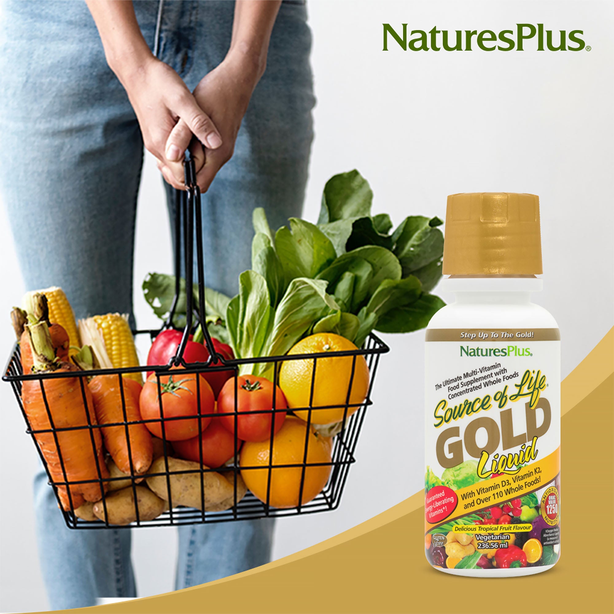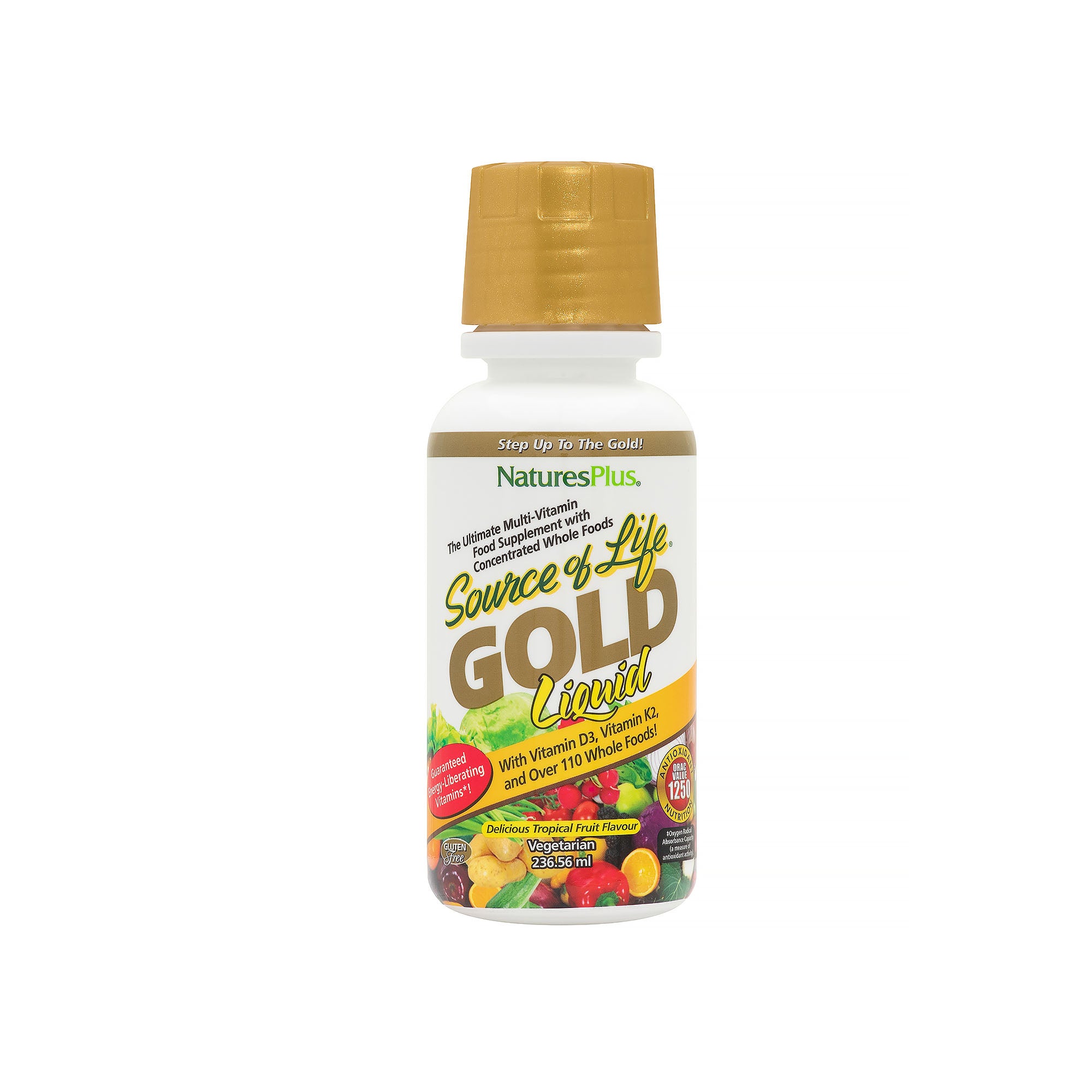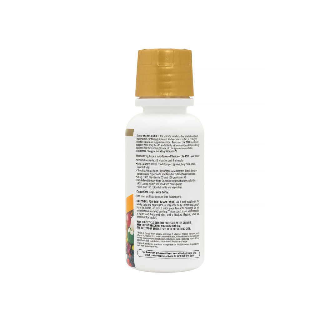 "Source of Life Gold is the most comprehensive and advanced whole food multivitamin supplement available. Revolutionary, all-natural ingredients with a unique blend of superfoods, energy enhancing and immune supporting nutrients. With more than 110 colourful fruits and vegetables, NaturesPlus pioneered the addition of synergistic organic whole food phytonutrients to vitamin and mineral supplements. With an irresistibly delicious tropical fruit flavour, Source of Life Gold Liquid delivers the innovative features, high quality and guaranteed potency of the Source of Life Gold line of supplements. The result is peak nutrition, increased energy."