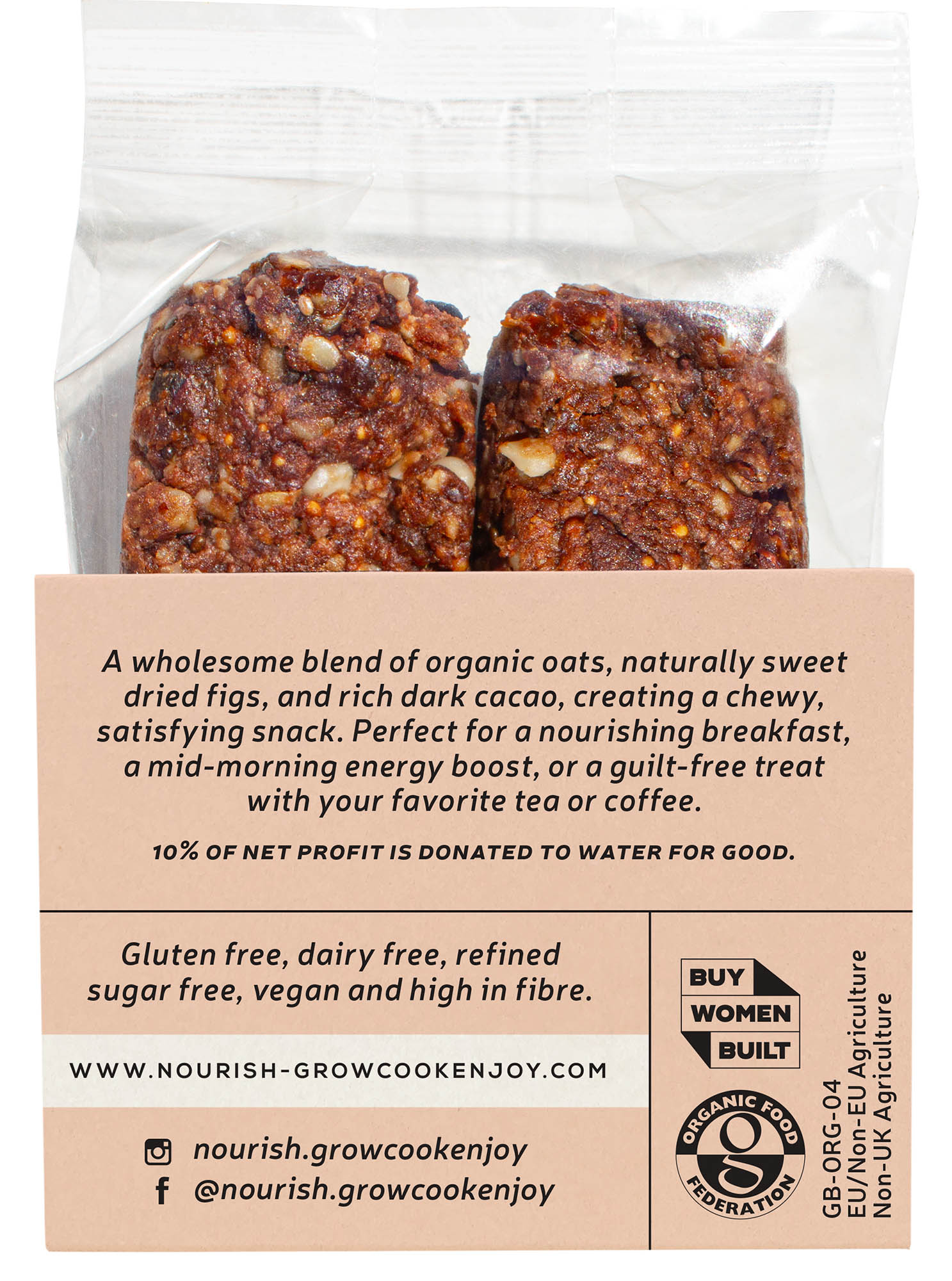 A wholesome blend of organic oats, naturally sweet dried figs, and rich dark cacao, creating a chewy, satisfying snack. Perfect for a nourishing breakfast, a mid-morning energy boost, or a guilt free treat with your favourite tea or coffee.