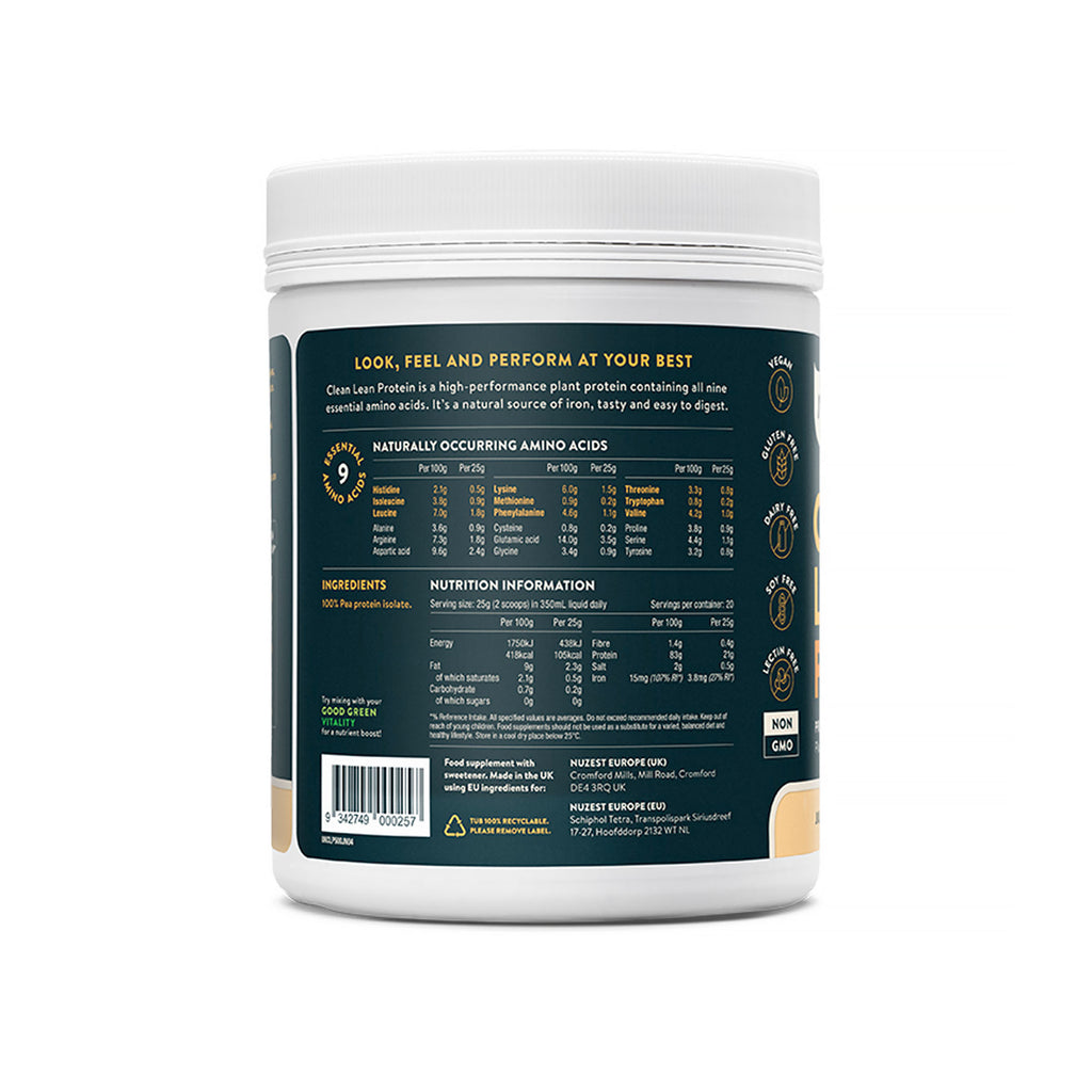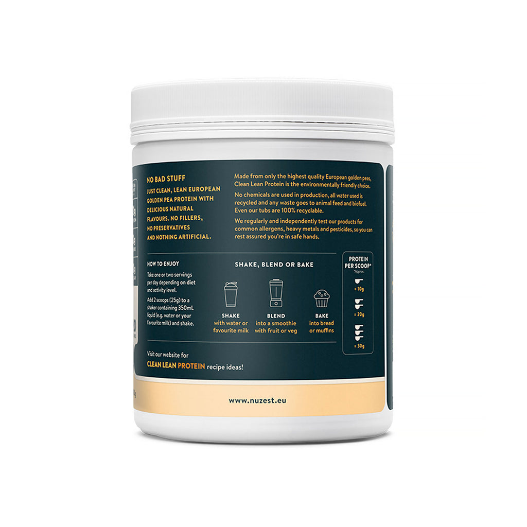 "Nuzest Clean Lean Protein Just Natural — 'Lead by Nature and backed by Science', a functional formulation to help support your peak health and performance. Vegan and Keto friendly, free from gluten, GMO, lectins, soy, dairy and xanthan gum. Each serving includes 19g of patented, water-extracted, chemical solvent-free, pesticide-free, complete pea protein with a balanced ratio of amino acids, including all 9 essential amino acids. Nuzest European golden peas are sustainably grown in Northern Europe with no requirement for nitrogen fertiliser or irrigation. Pesticide free. The bio-plastic tubs are made from sugar-cane derived HDPE, a renewable and sustainable resource and one of the most easily recyclable green plastics available. Both tub and lid can be recycled."