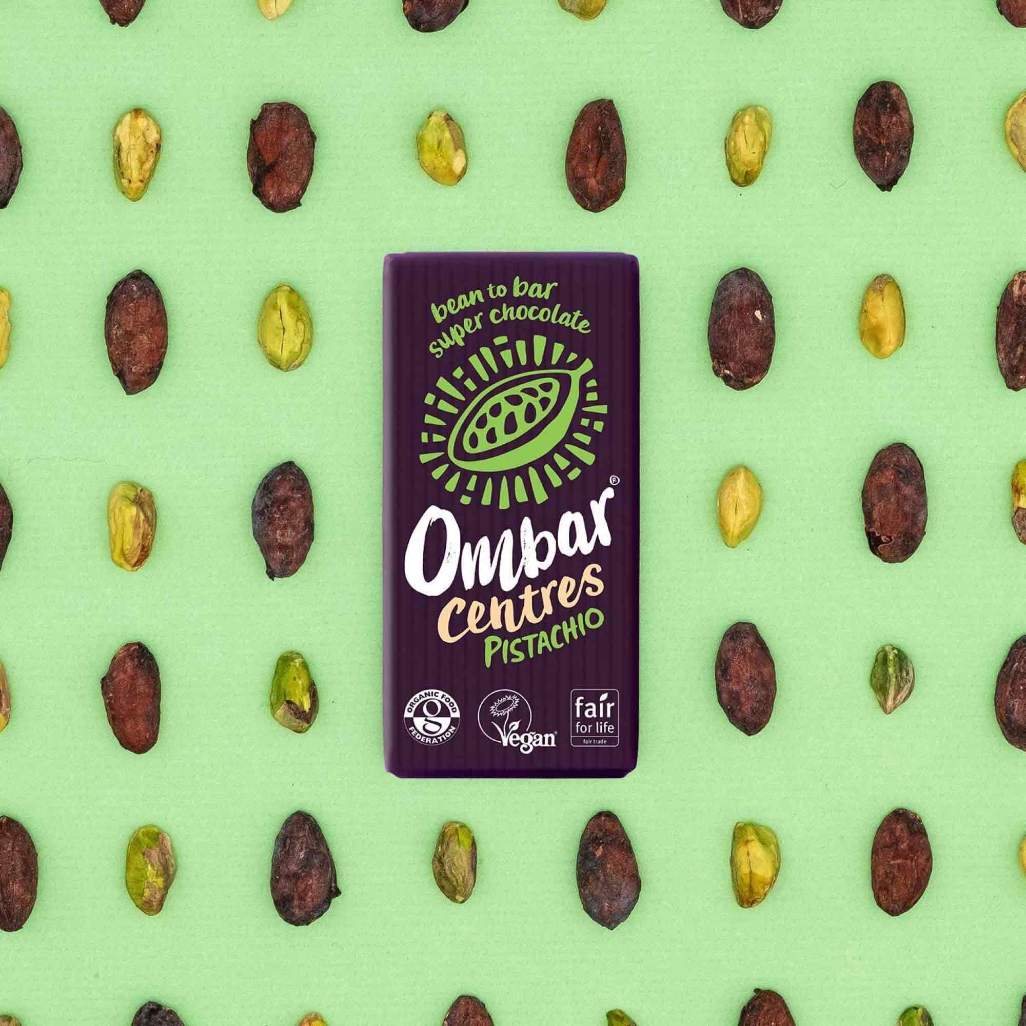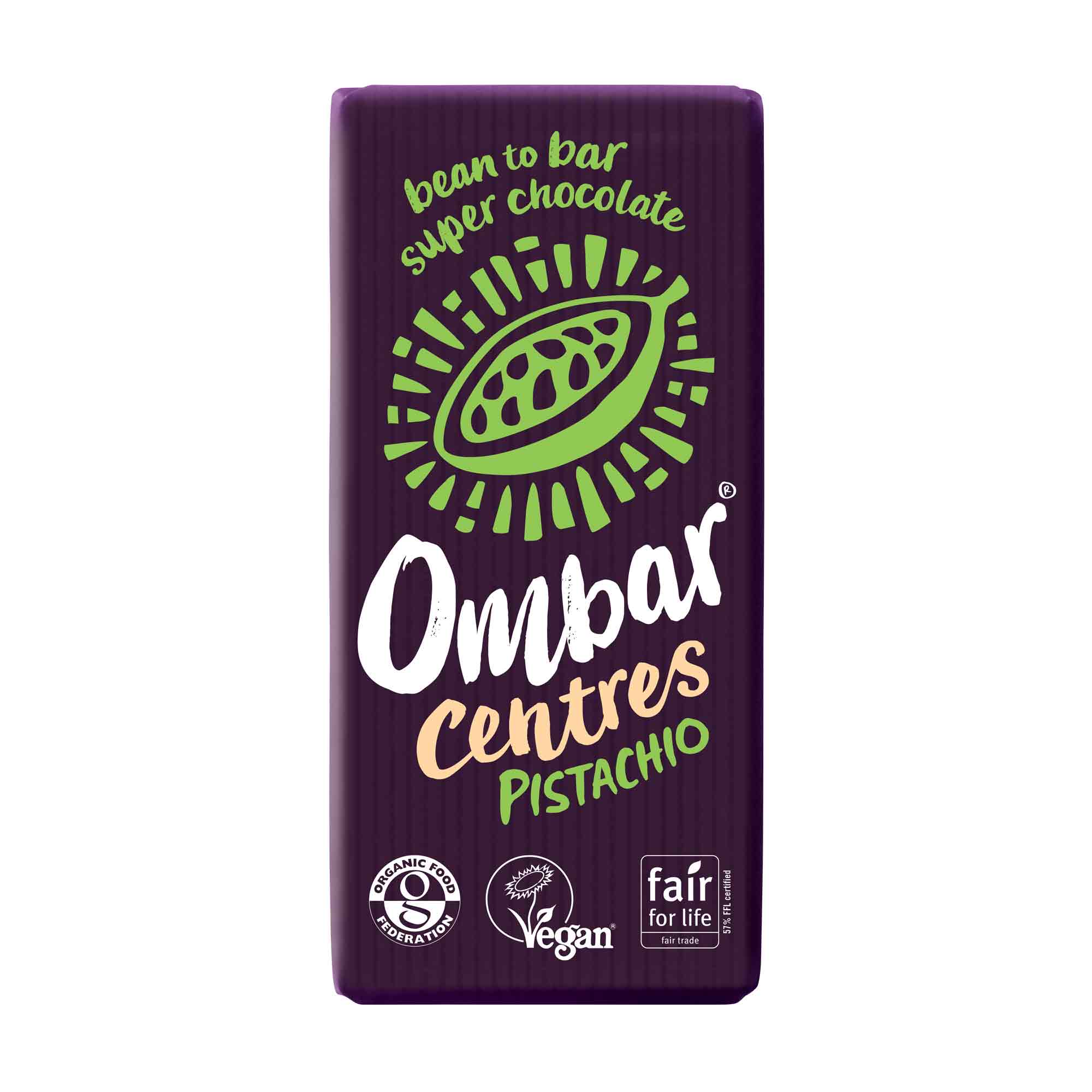 "Rich, creamy 60% dark chocolate with a delicate and nutty pistachio centre, from Ombar's indulgent Centres range."